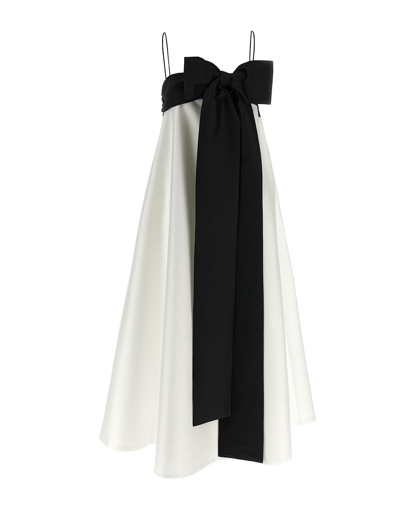 Long 'Bailey' taffeta dress with sweetheart neckline, thin straps, structured bustier top and front bow detail, pockets, side zip closure, underskirt.
