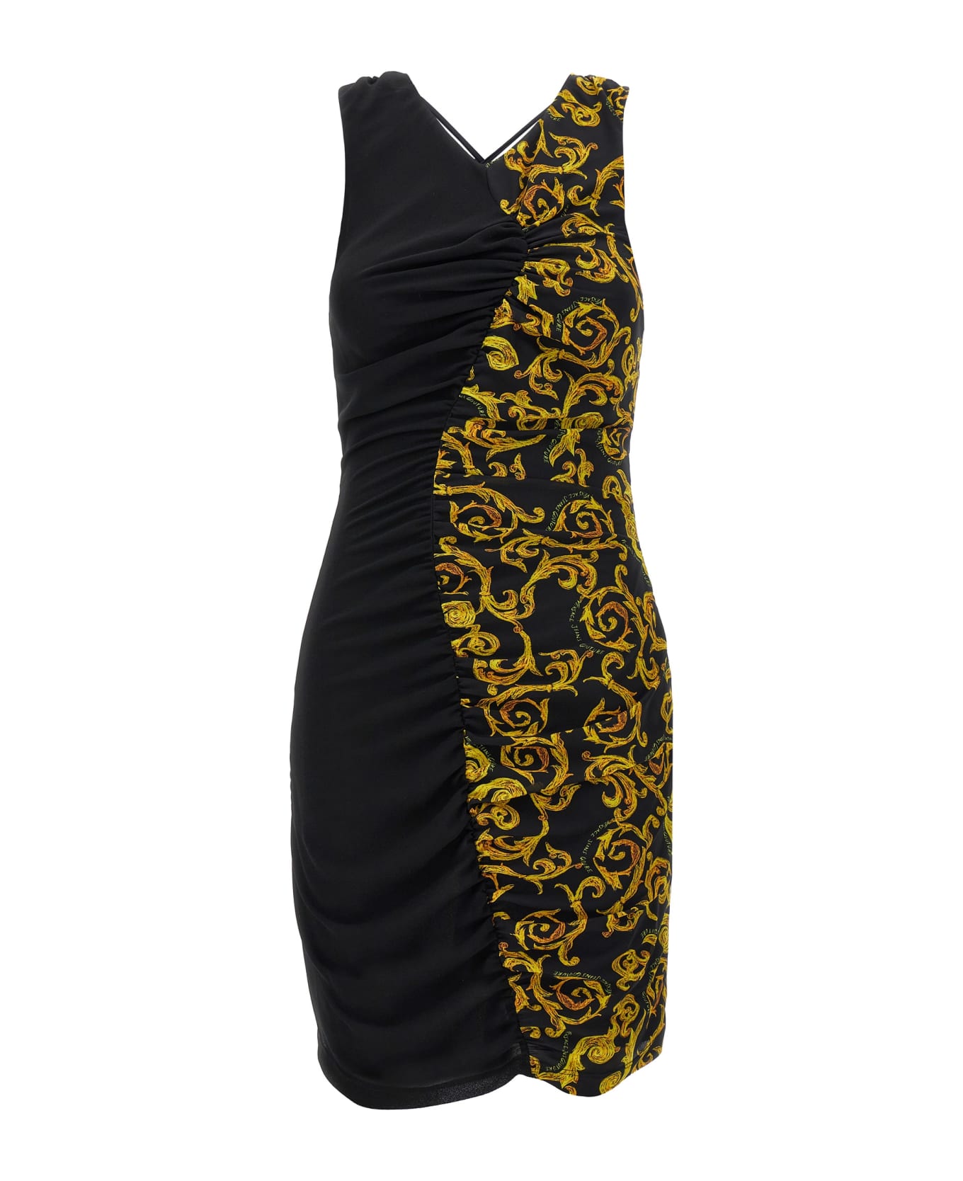 Georgette sleeveless dress with 'Barocco' print, V-neck, thin shoulder straps crossed and fastening at the back, a back zip closure. Composition: 100% polyester