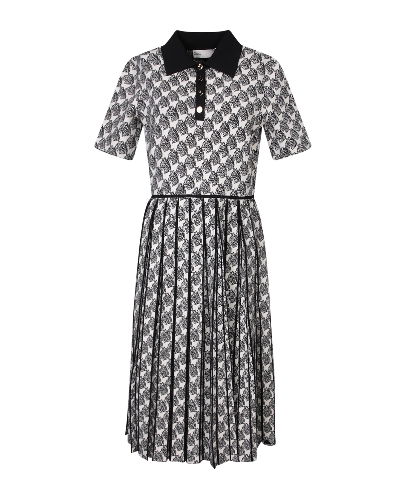 This distinctive Tory Burch dress features a bold zebra jacquard pattern, highlighted with a black polo collar and a flowing silhouette with a pleated skirt for timeless elegance.