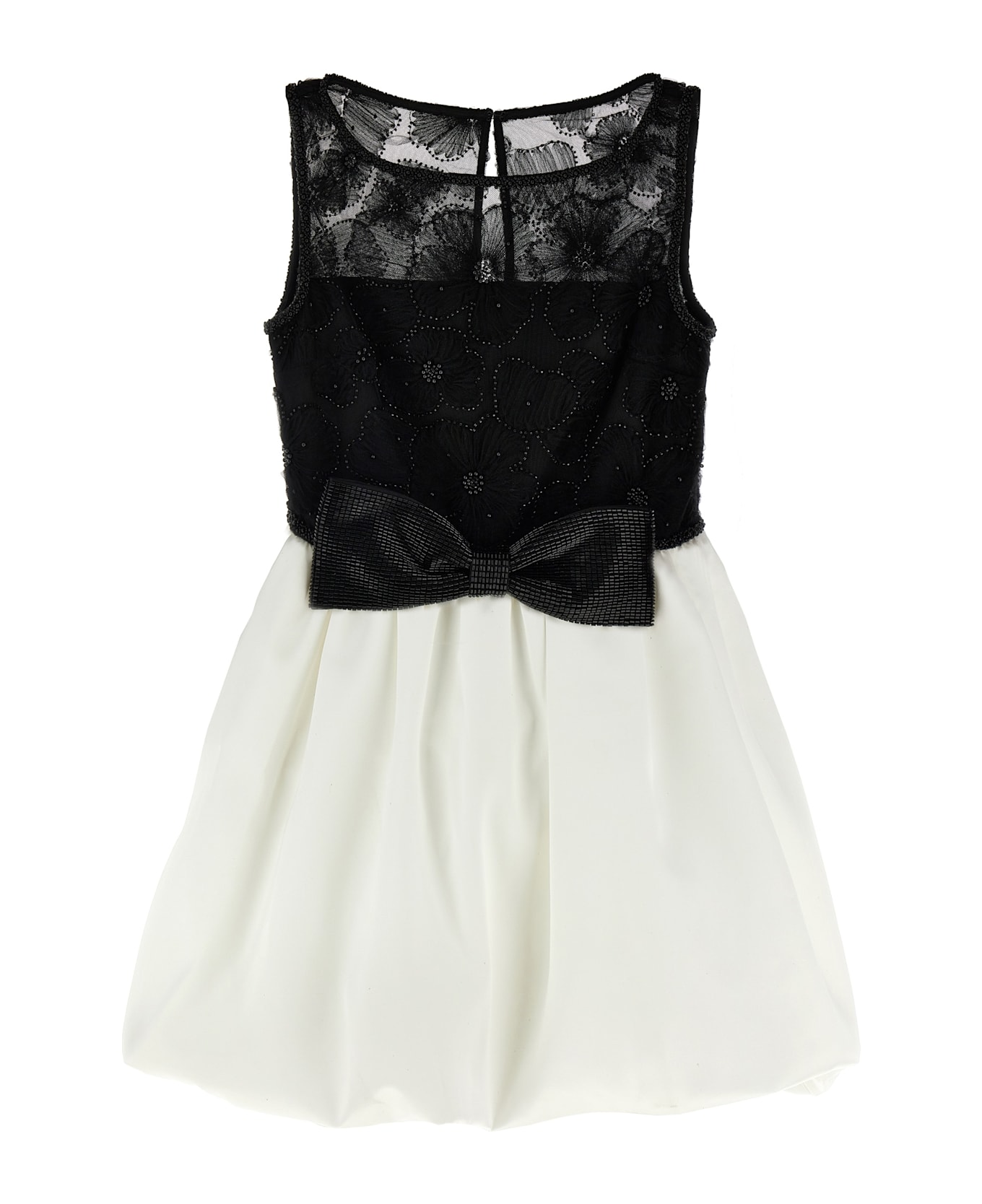 'Black And White Tulle Mini' dress in tulle composed of semi-transparent upper part worked with tone-on-tone floral decorations and beads applied, sleeveless, boat neckline, back teardrop cut out detail with button closure, balloon skirt with maxi bow decoration with front beads, pockets, back zip closure.