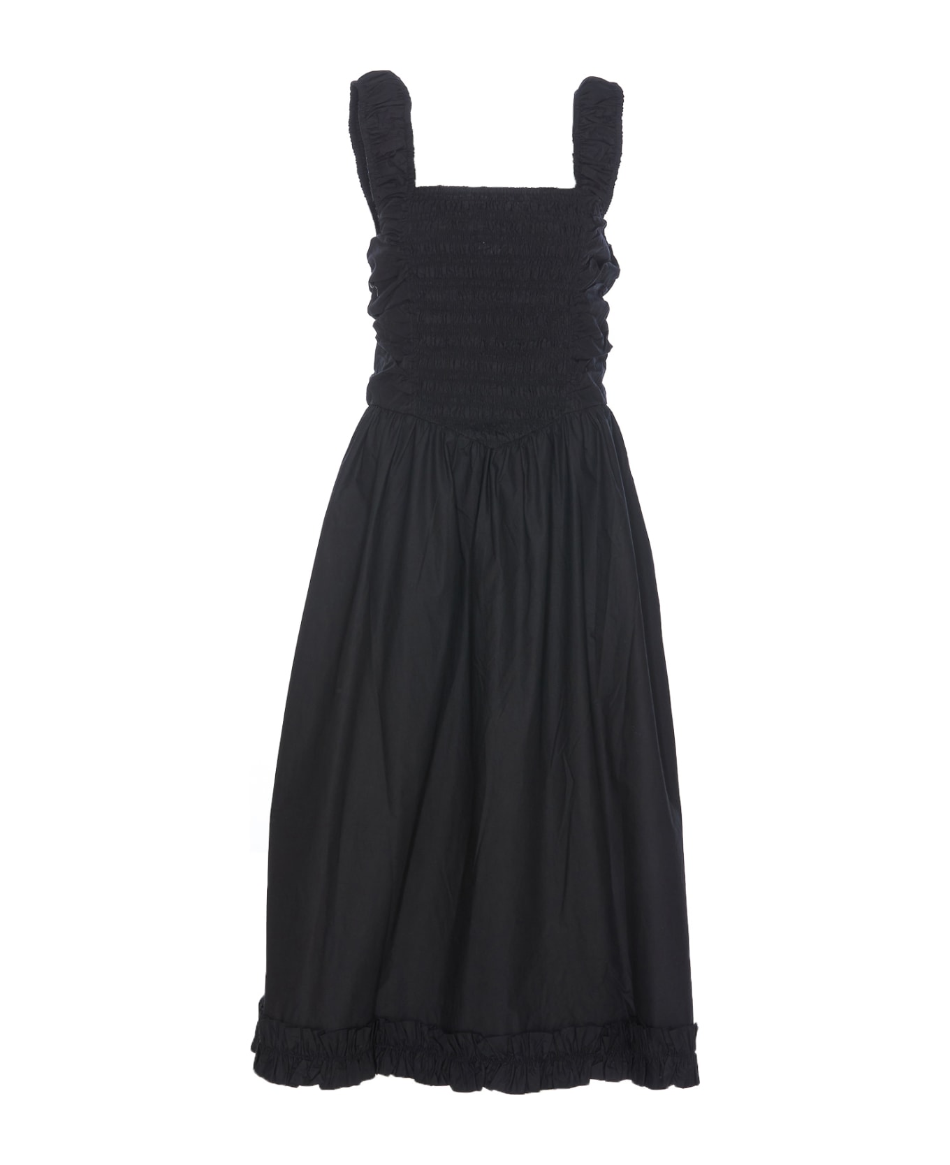 Ganni black dress, elasticized model, detail on the back, midi model, detail at bottom, sleeveless, straight neckline Composition: 100% Organic Cotton