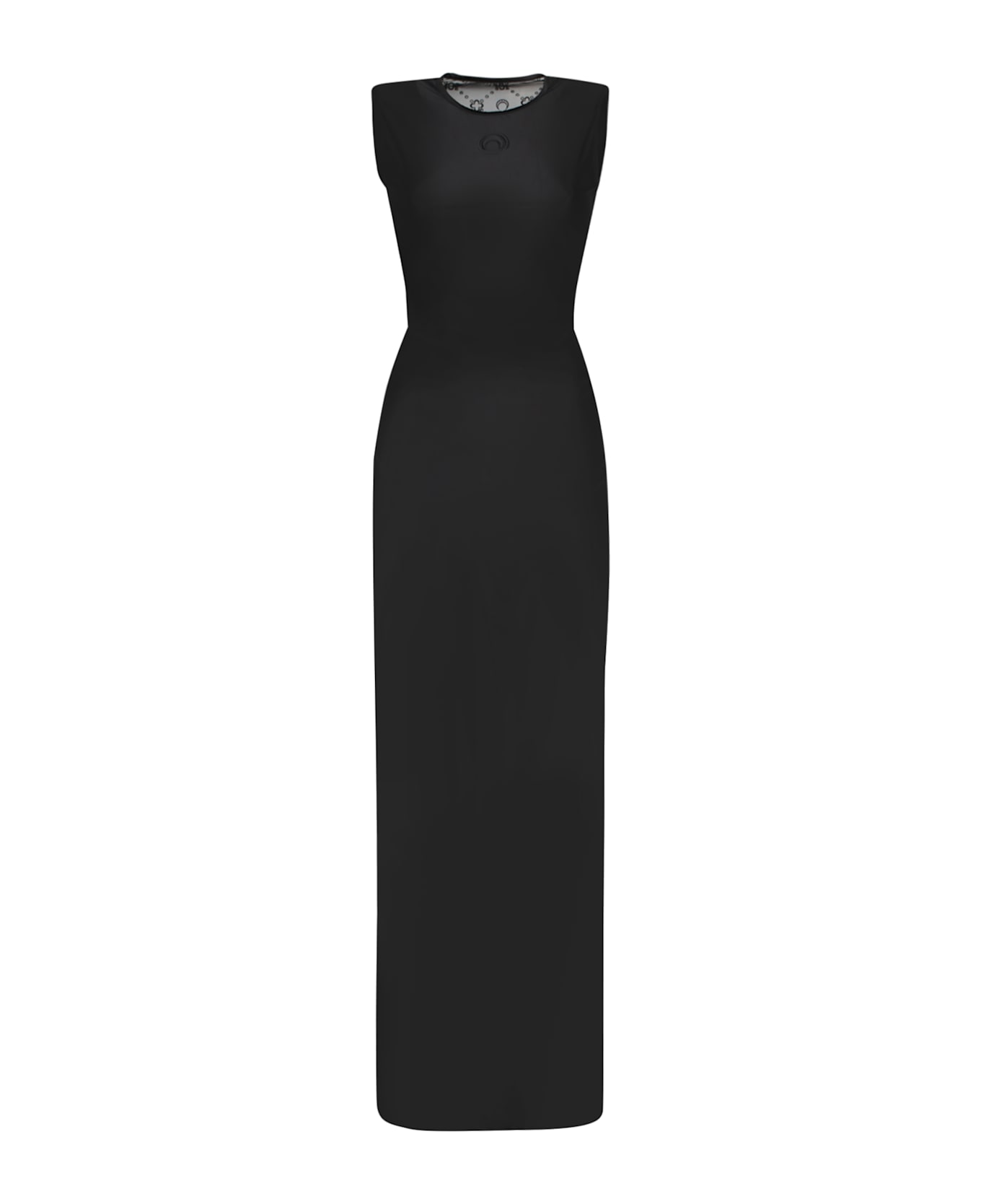 This elegant Marine Serre long black dress is crafted from a soft fabric that falls fluidly, providing a regal and sophisticated silhouette. The inside of the collar is finished with a unique print adding a touch of exclusivity.