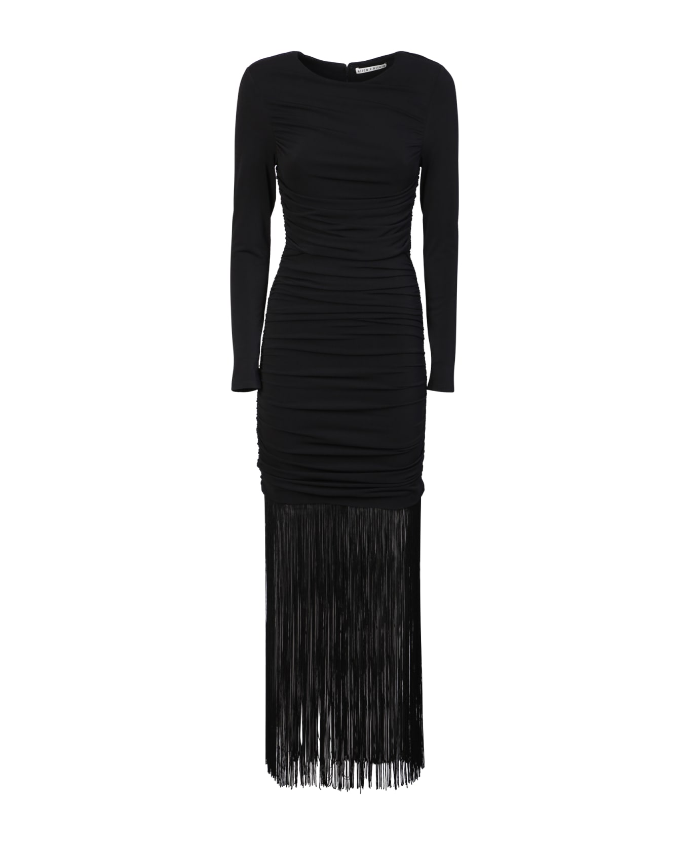 Roundneck. Long sleeves. Fringed edge. Fitted waistline. Straight hem. Color: black