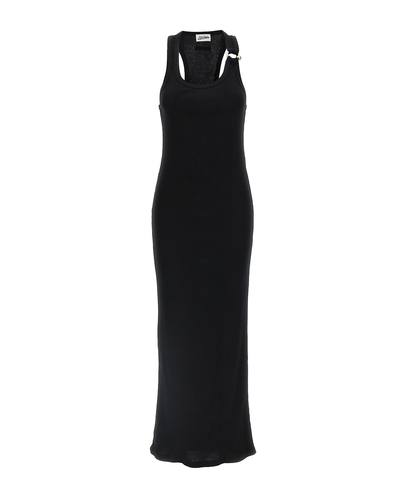 Long dress in stretch ribbed cotton with 'Black Piercing' detail on the left shoulder strap, wide round neckline, sleeveless.