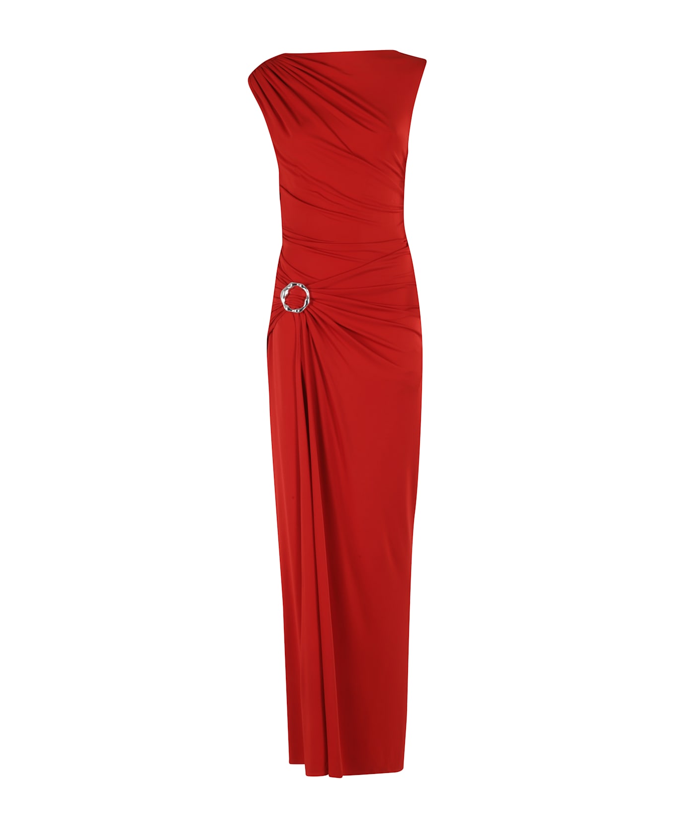 Blaine long dress -Simkhai -Color crimson -Circle neck -Asymmetrical sleeves -Side zipper closure -Side slit -Silver metallic detailing