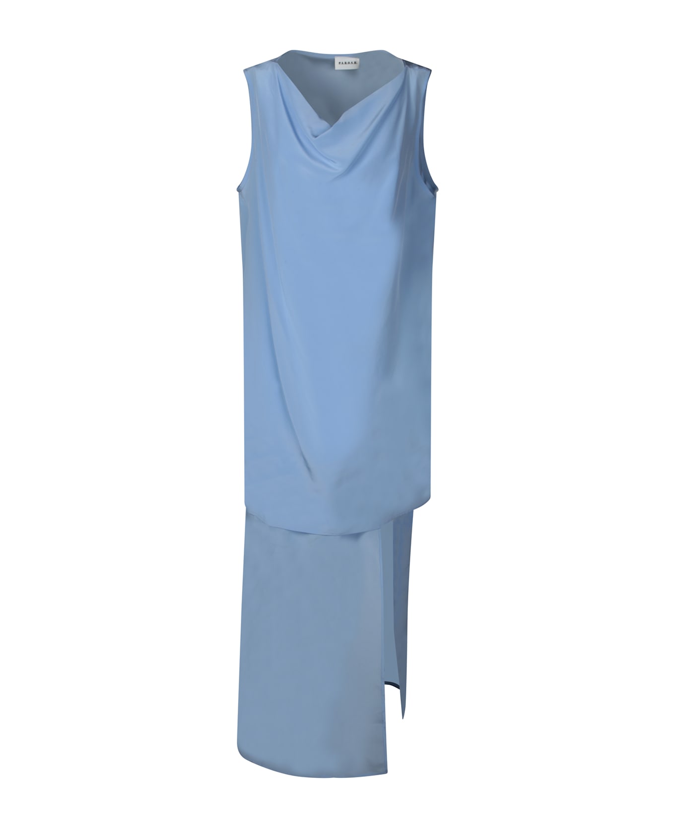 This elegant blue crepe de Chine dress from PAROSH features a sophisticated and modern silhouette, accentuated by a crossover neckline and a belt that highlights the waist.
