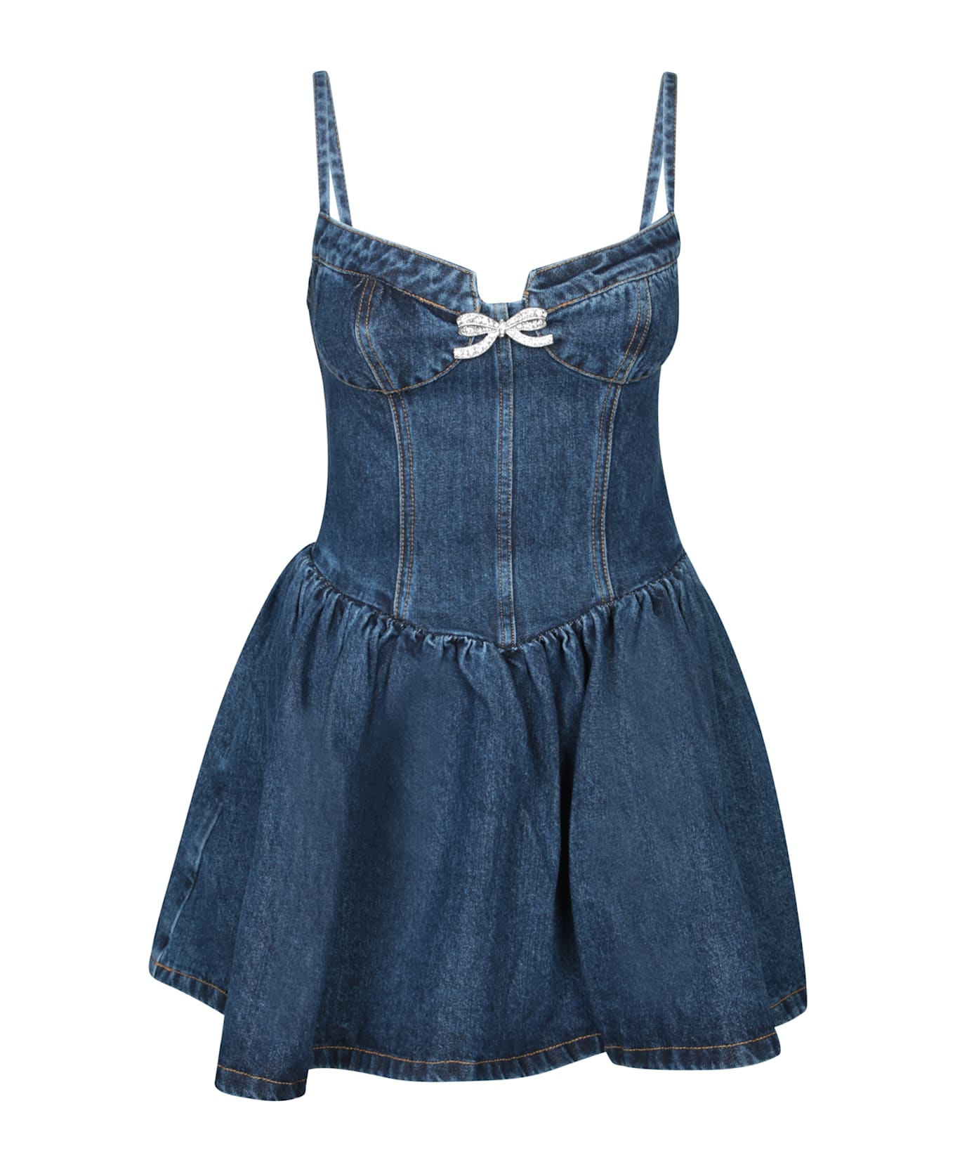 Elegant mini denim dress featuring a neckline accentuated with a sophisticated diamond-adorned bow, perfect for a youthful and fresh look.