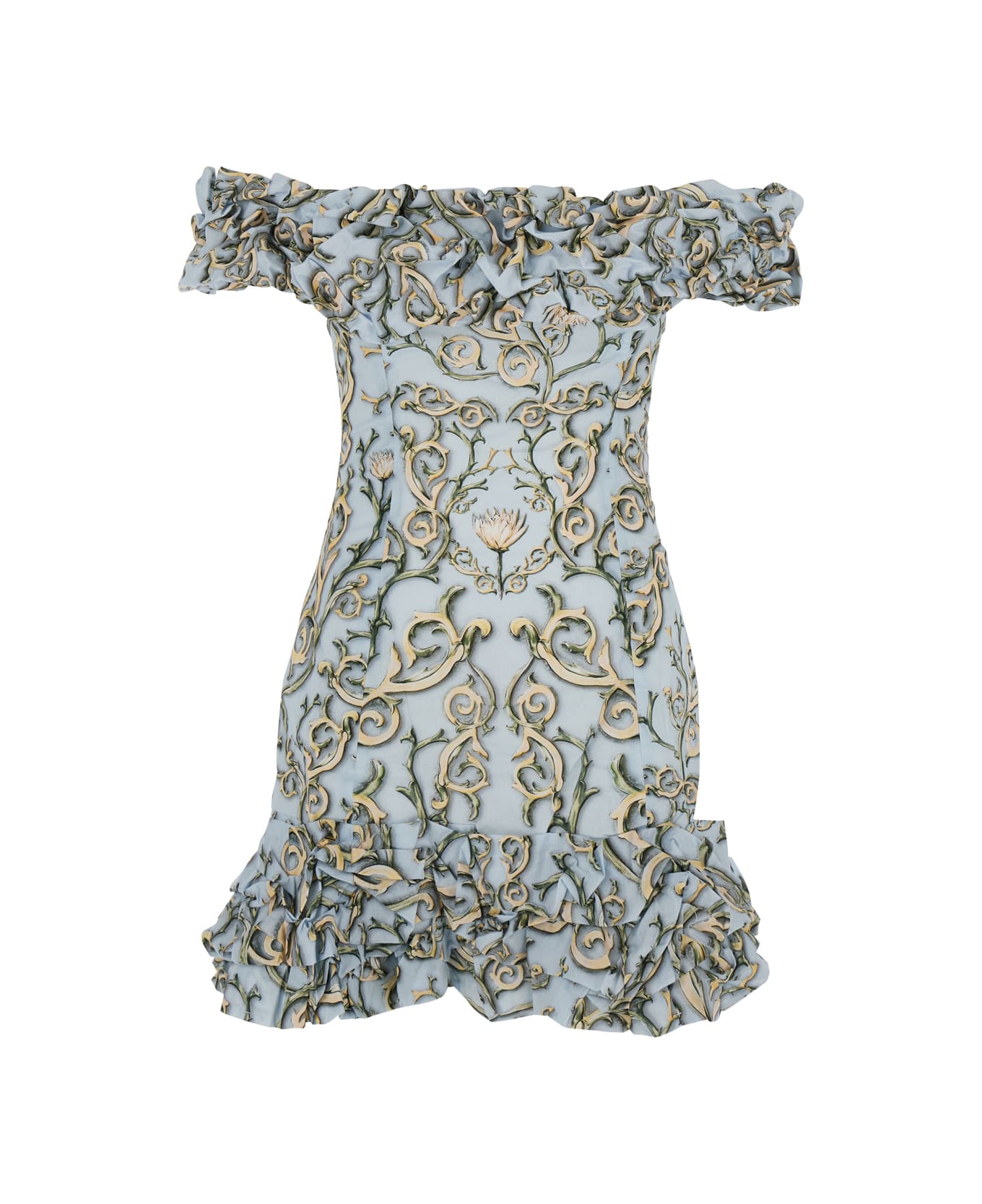 Blue Dress With Ruche And All-over Floral Printed Motif In Cotton Woman