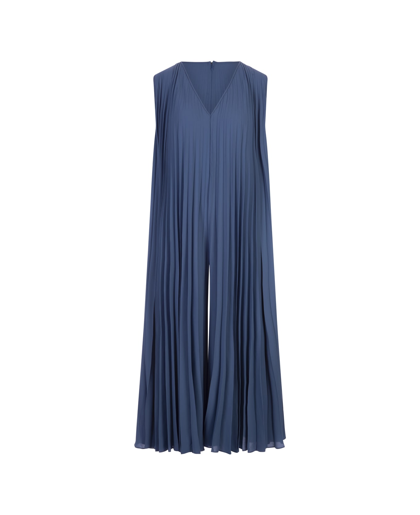 Sleeveless jumpsuit by Gianluca Capannolo in blue pleated silk with V-neck, back zip fastening and wide, flared leg.