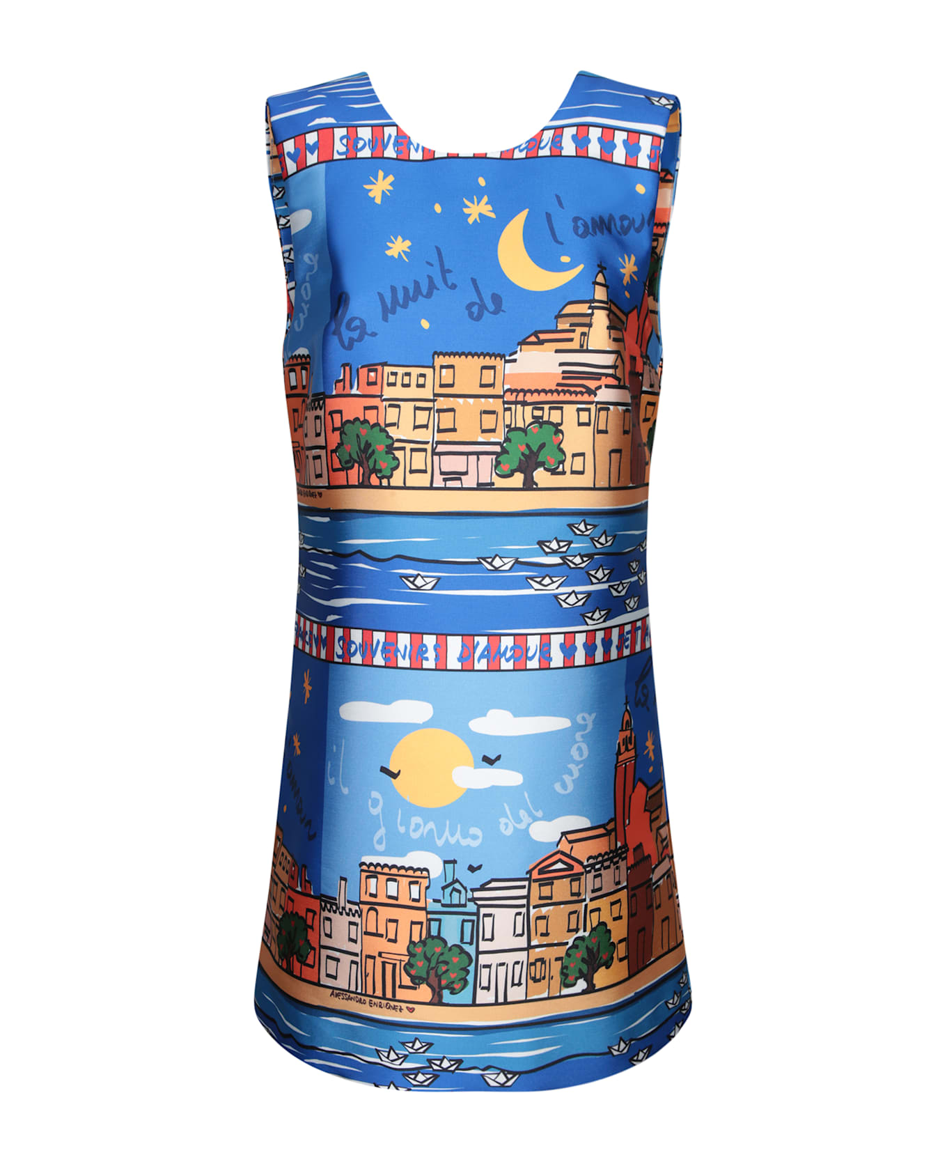 This trapezoidal dress by Alessandro Enriquez captures the lively spirit of Italian towns with a picturesque and colorful print, perfect for a distinctive summer look.