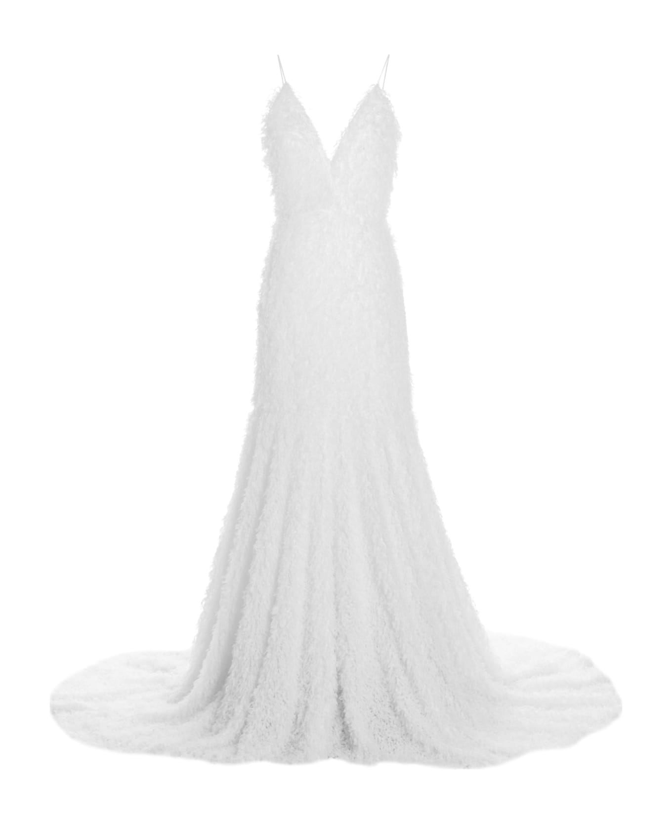 Bridal capsule 'Miley' maxi dress with thin straps, V-neck, all-over feather appliqués, tight waist, back hook closure, open back and subtle train. Composition: 100% polyester