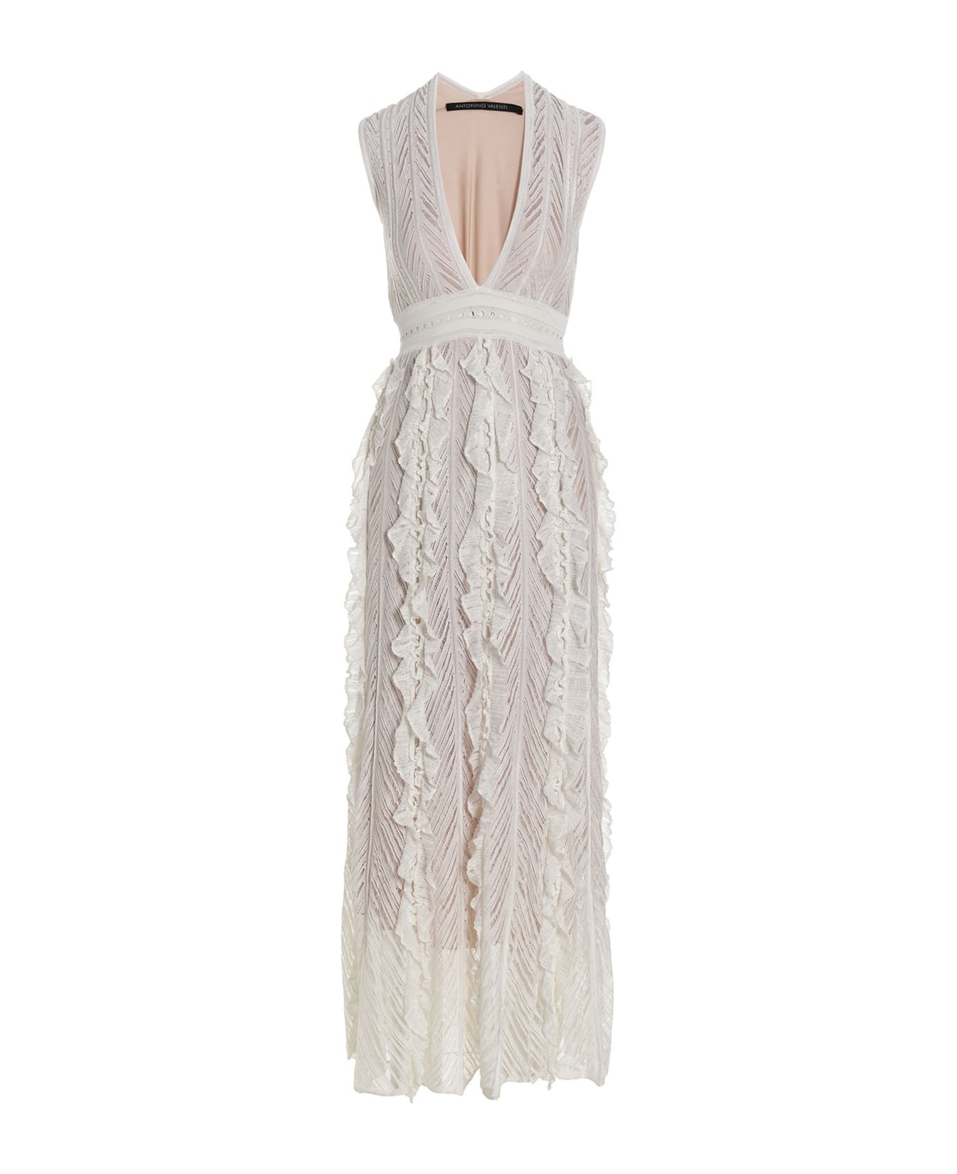'Briseide' maxi dress with V-neck, inner slip and all-over ruffles. all-over ruffles.