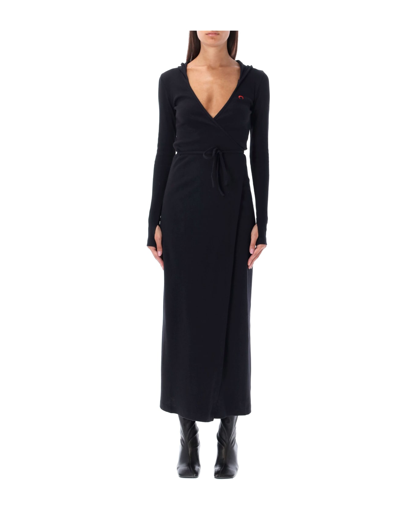 Cotton Blend Cache-coeur Hoodie Midi Dress By Marine Serre. Featuring: V-neck Wrap Design Long Sleeves Thumbholes Red Embroidered Logo At Chest Red Logo Patch At Back Ribbed Design The Model Is 1,72 M Tall And She's Wearing Size S