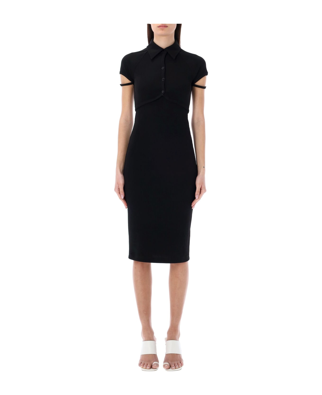 Stretch Cardigan Dress By Helmut Lang. Featuring: Spread Collar Short Sleeves With Straps Detail Three-button Placket Fitted Silhouette Knee-length Model Is 1,72 M Tall And She Is Wearing Size S