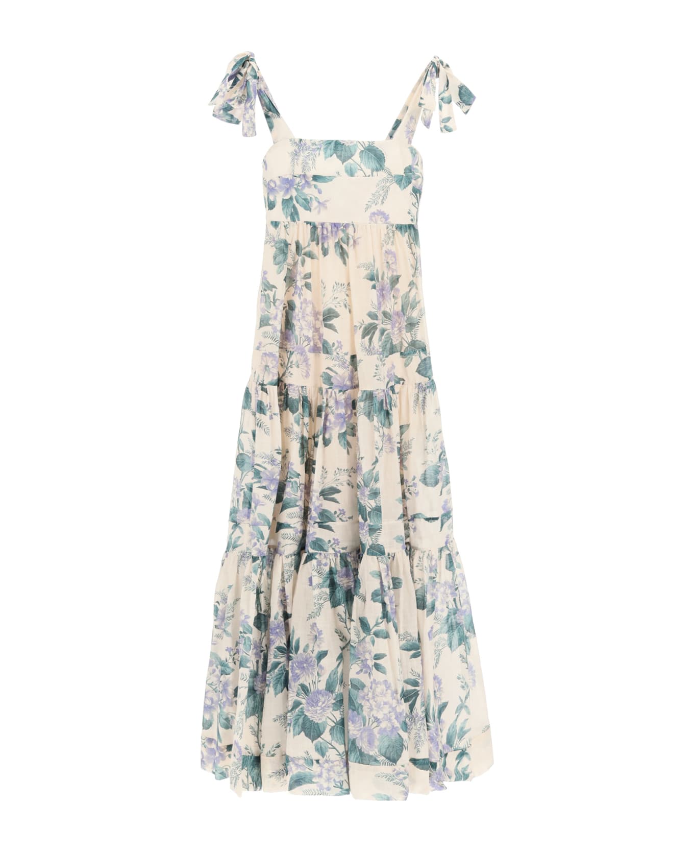 Zimmermann midi dress in pure linen with all-over "Hydrangea Floral" print, detailed with bows to tie on the shoulders. Loose fit with multi-tiered skirt and smocked bodice on the back. Back invisible zip closure, cotton voile lining. The model is 177 cm tall and wears a size 1 Zimmermann.