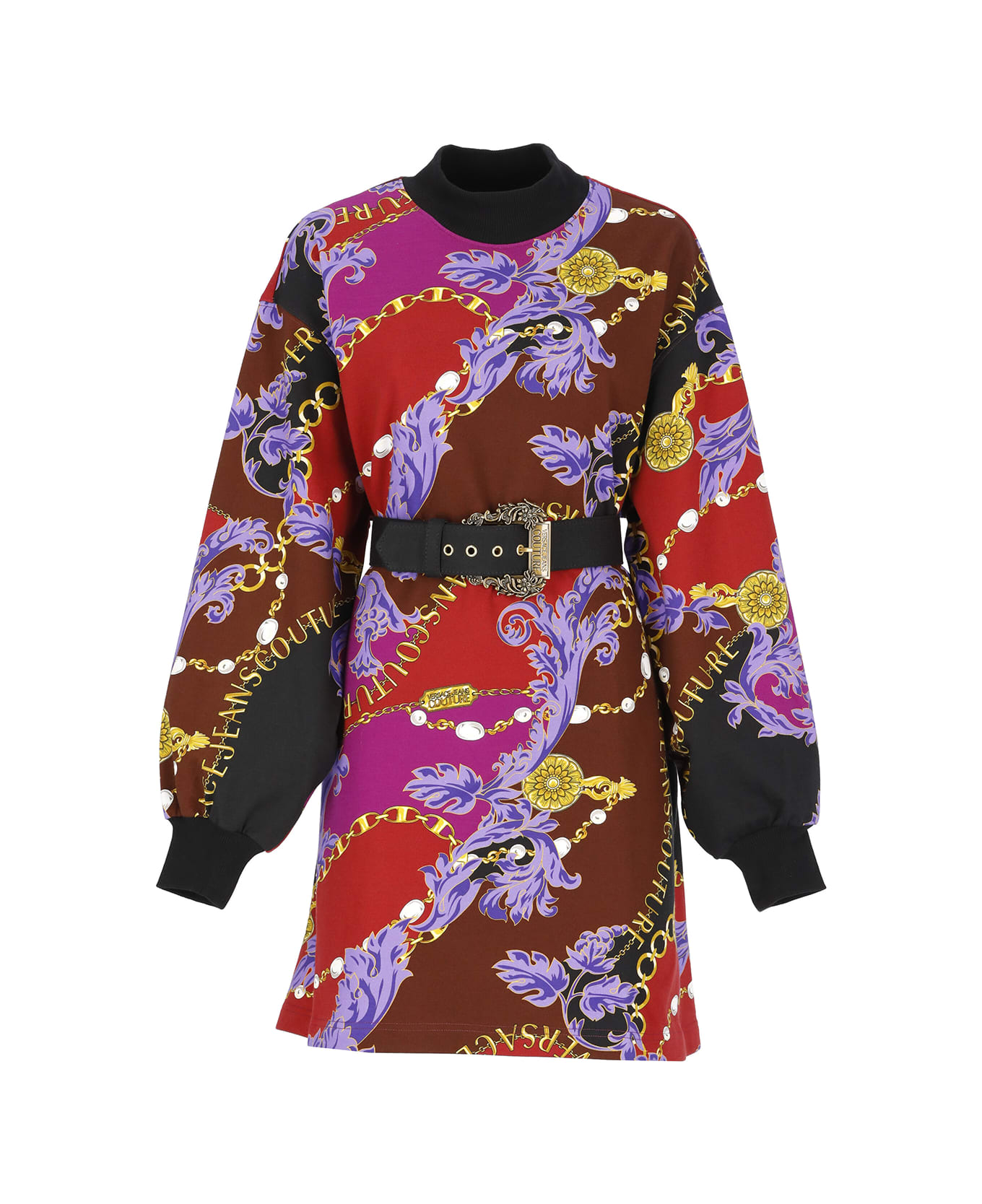 - Multicolor Versace Jeans Couture cotton dress for woman - High neckline - Oversize long sleeves - Dropped shoulders - Elastic ribbed trims - All-over Chain Couture pattern - Matching belt included with metal Baroque buckle