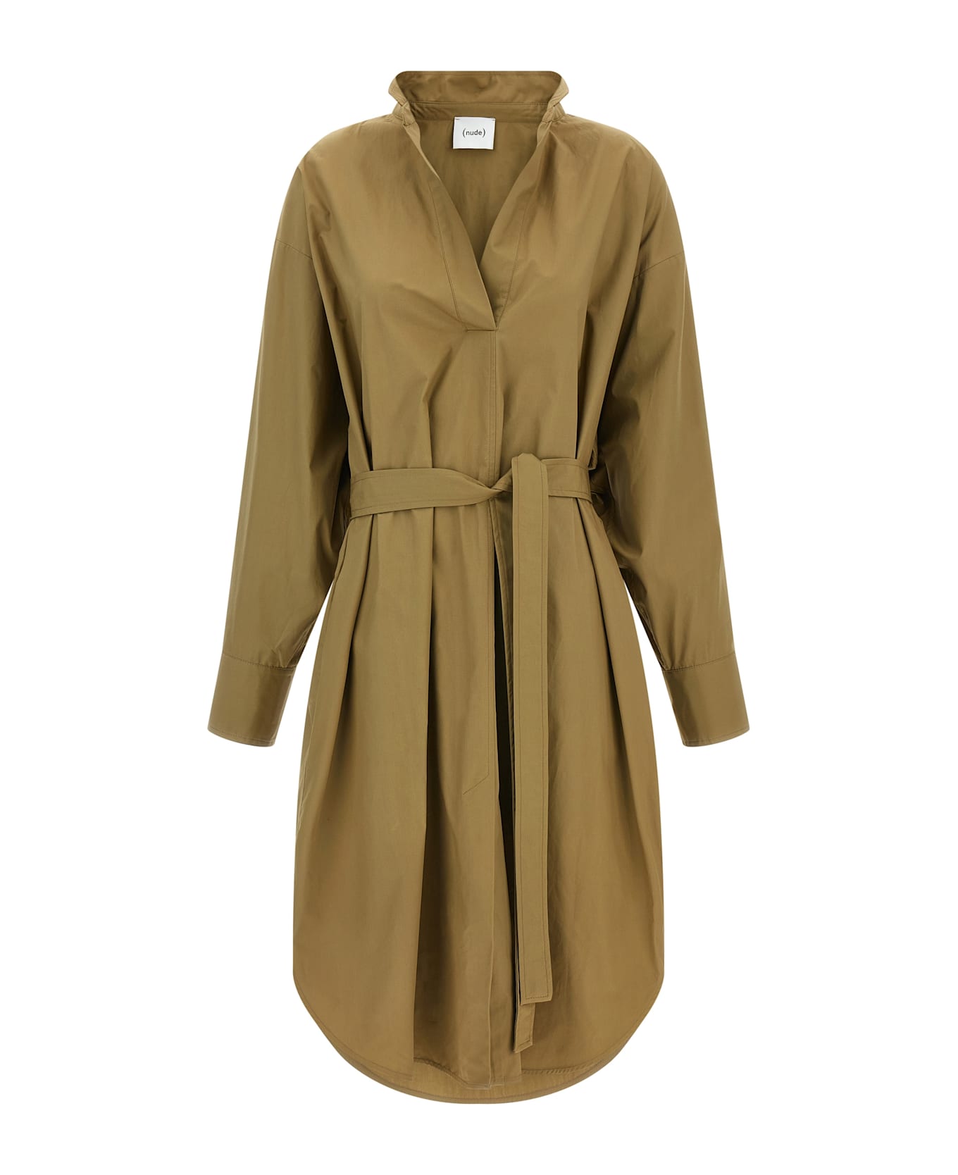 Chemisier midi dress in cotton poplin with open collar, long sleeves with cuffs and dropped shoulder, pockets, front and side slits, rounded hem, and removable matching belt.