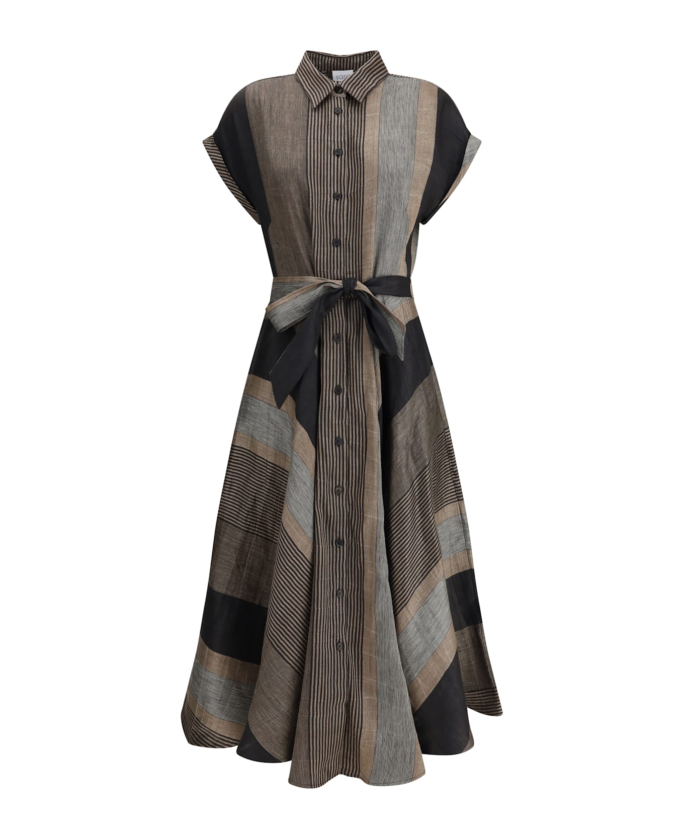Sara roka's chemisier dress captivates with its striped patchwork pattern and fresh, feminine design. featuring short sleeves, a classic collar and front button closure, it is complemented by a matching removable knotted belt that enhances the silhouette with elegance and versatility.