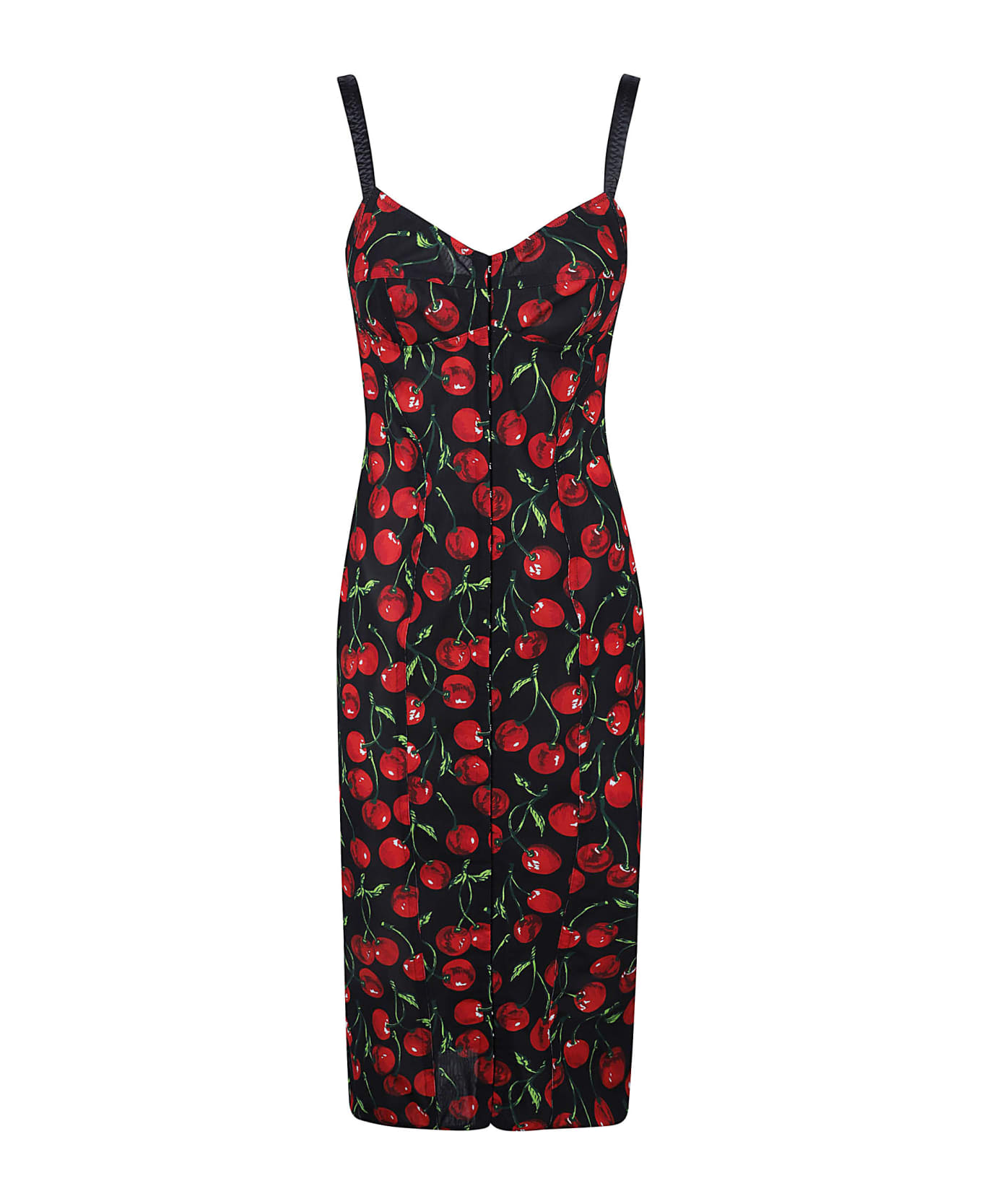 cherry-print midi dress from DOLCE & GABBANA featuring black/multicolour, slim cut, signature cherry print, scallop edge, bustier-style neckline, front hook and eye fastening, rear zip fastening, sleeveless, straight hem and mid-length.