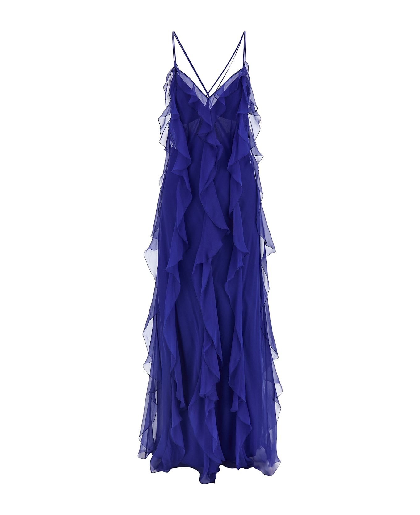 Long silk chiffon dress with thin straps, V-neck with detachable petticoat, ruffle application, back zip and hook closure.