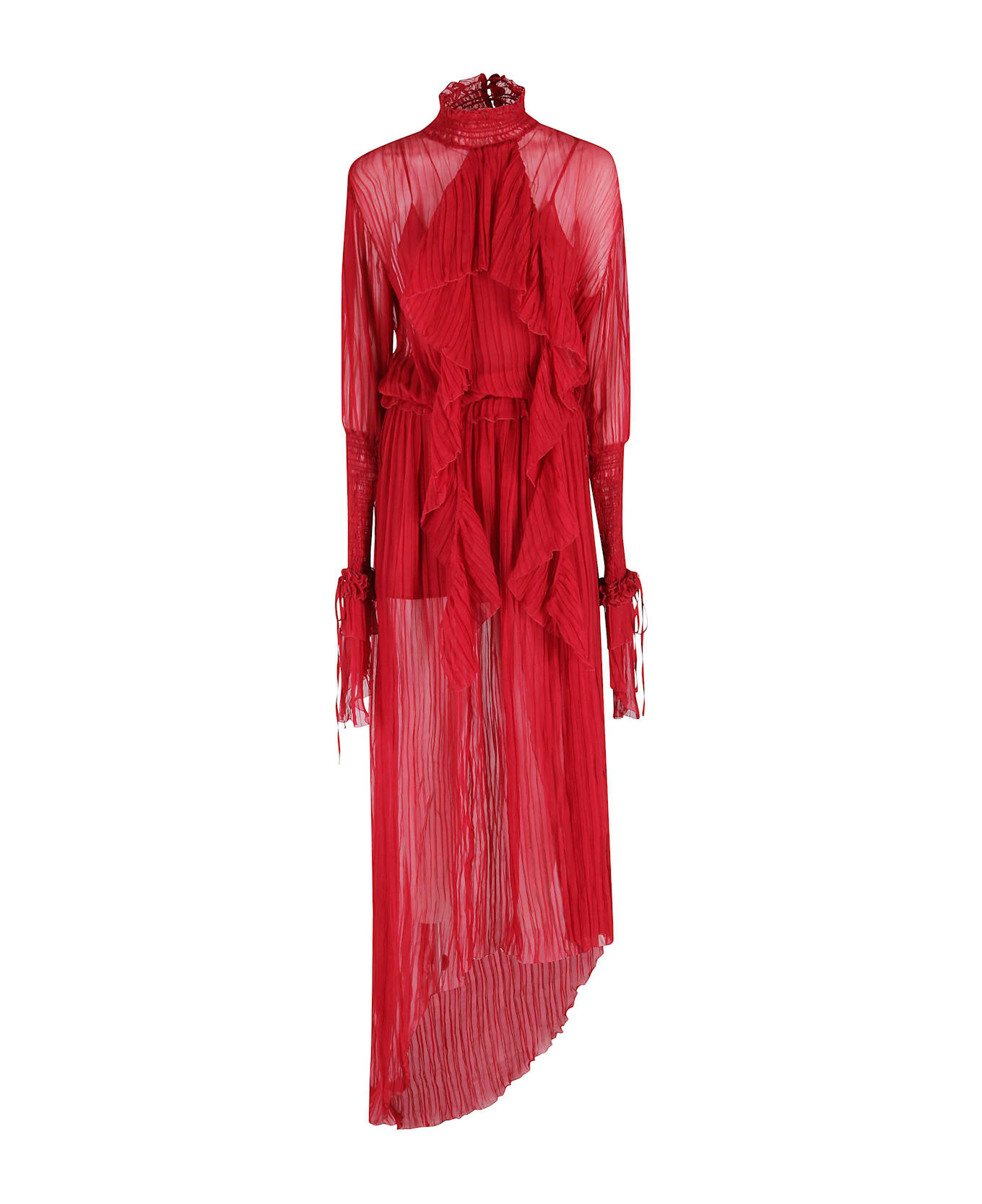 Dress - Blumarine - Red color - Pleated chiffon fabric - High neck - Long sleeves with ruffles at the bottom - Front ruffles - Long asymmetrical skirt.