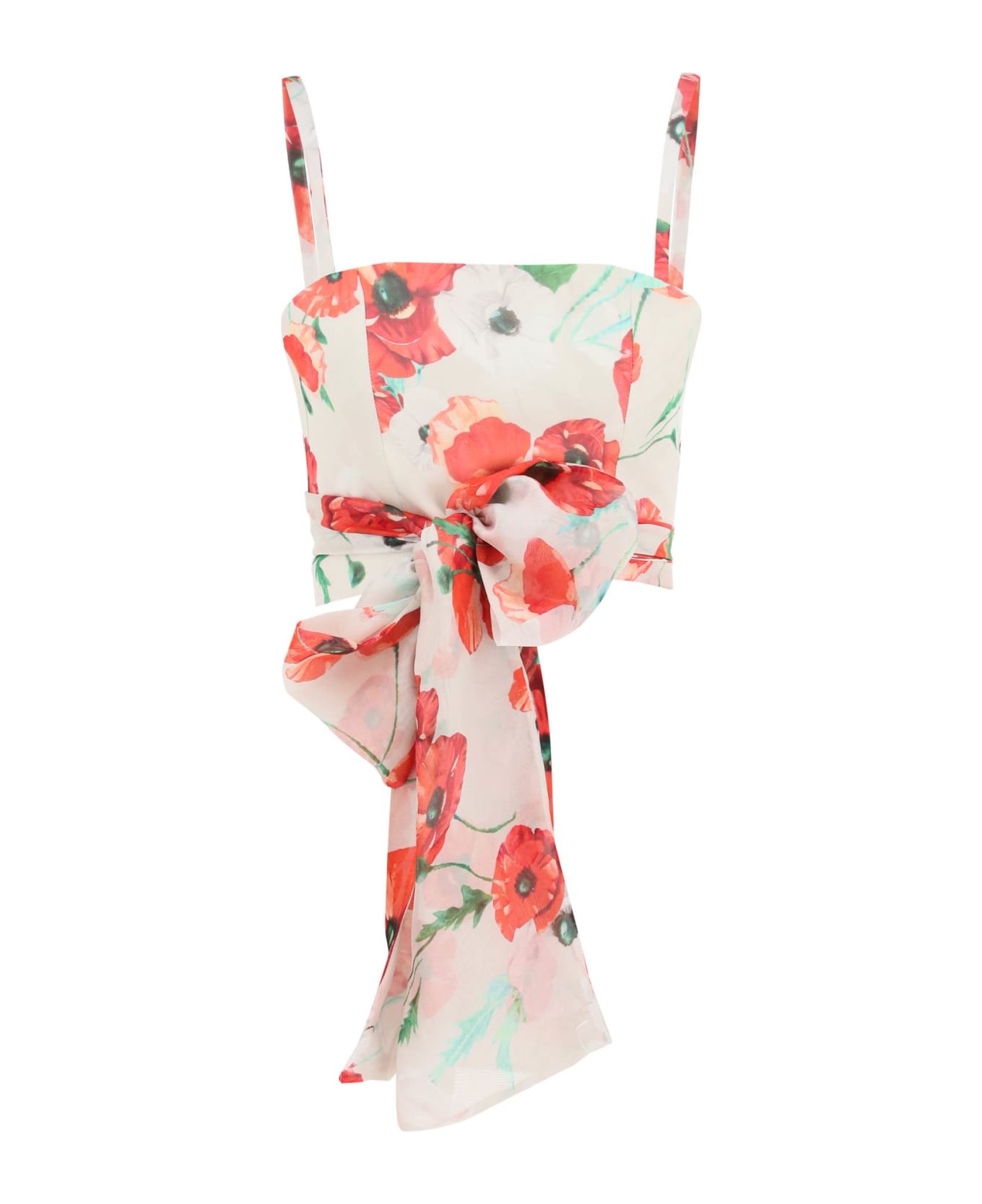 Top by Raquel Diniz made of floral-print silk chiffon with thin straps and bands to tie at the waist. The model is 177 cm tall and wears size 40.