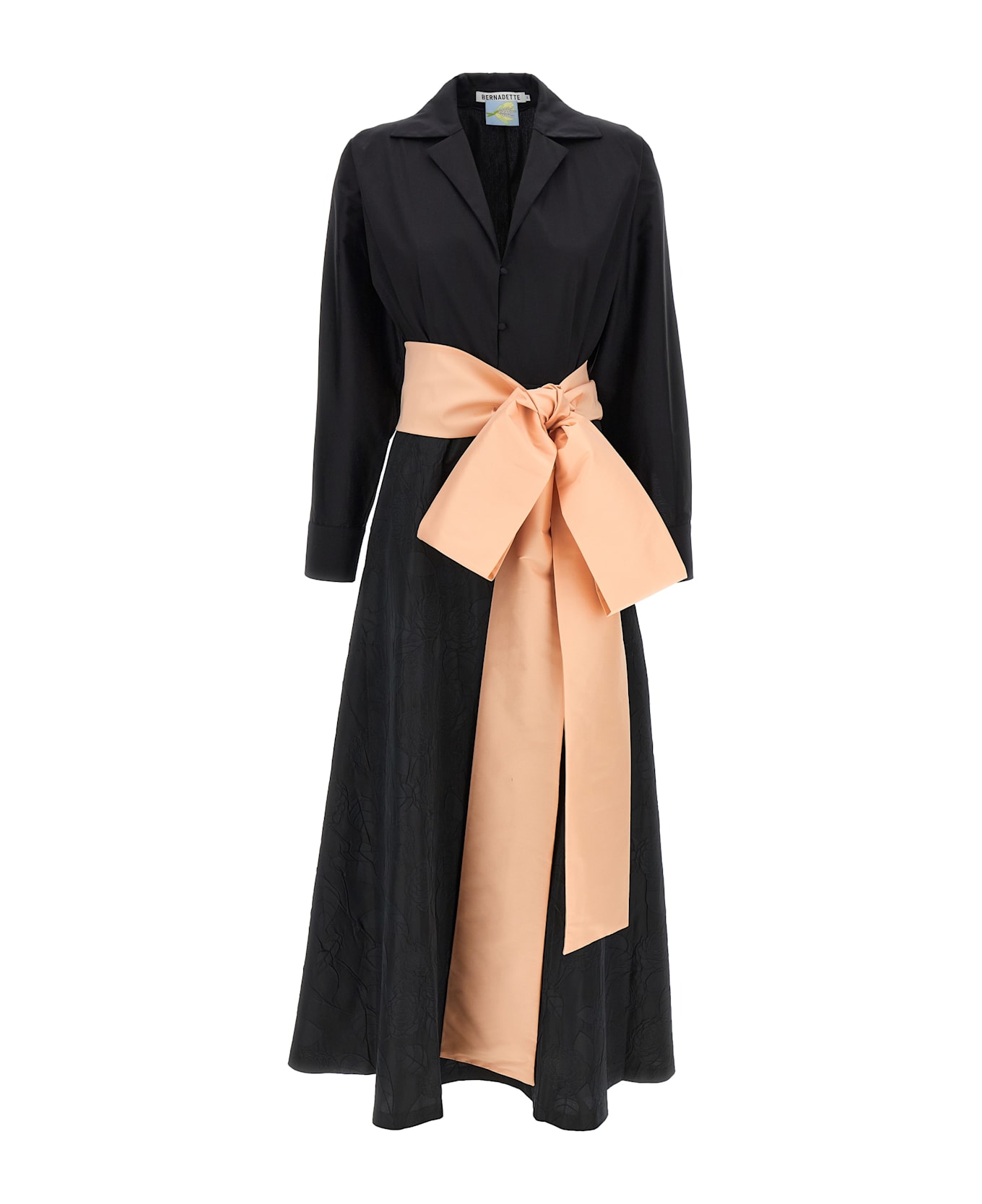 Long 'Clarence' dress with smooth cotton top, chemisier model, V-neck with front buttoning, long sleeves with cuffs and embossed Camellia print taffeta skirt, side zip closure, pockets, contrast sash tie at the removable waist.