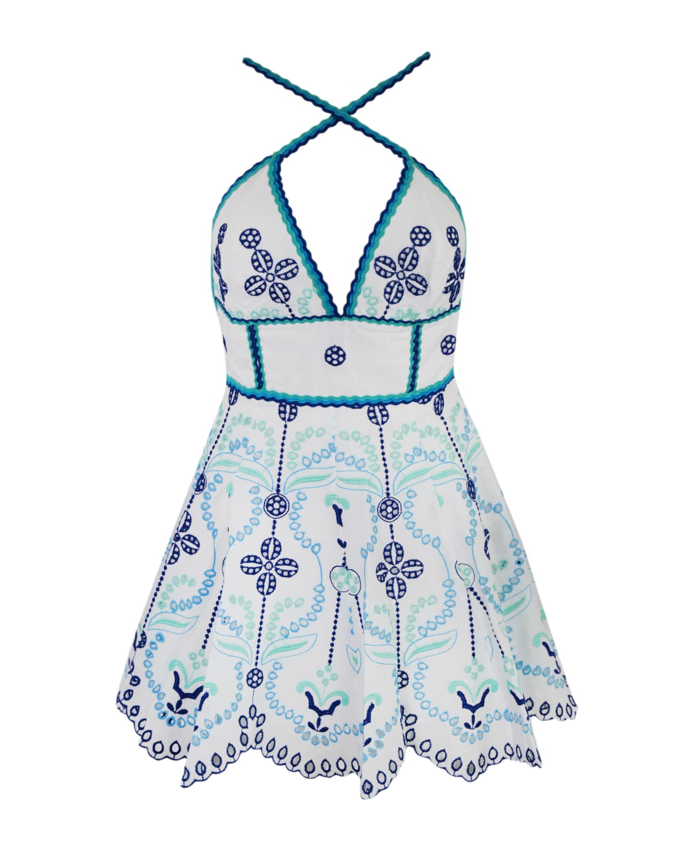 short women's dress with embroidery: cotton and linen v-neck sleeveless thin straps all-over embroidery anglaise design scalloped edges slim fit composition: 60% cotton, 20% linen, 20% polyester