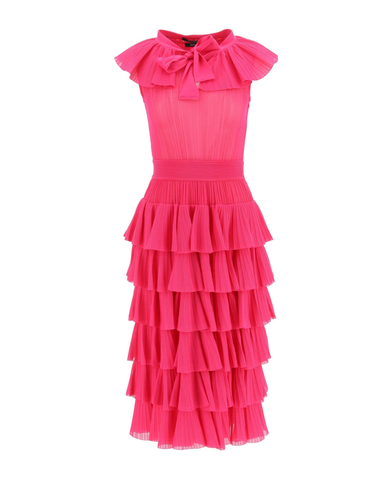 Sleeveless midi dress by Antonino Valenti, crafted in viscose blend knit with decorative ribbed motifs. Flared tiered flounce skirt, round neck with separate tie collar, side invisible zip closure. The model is 177 cm tall and wears a size IT 40.