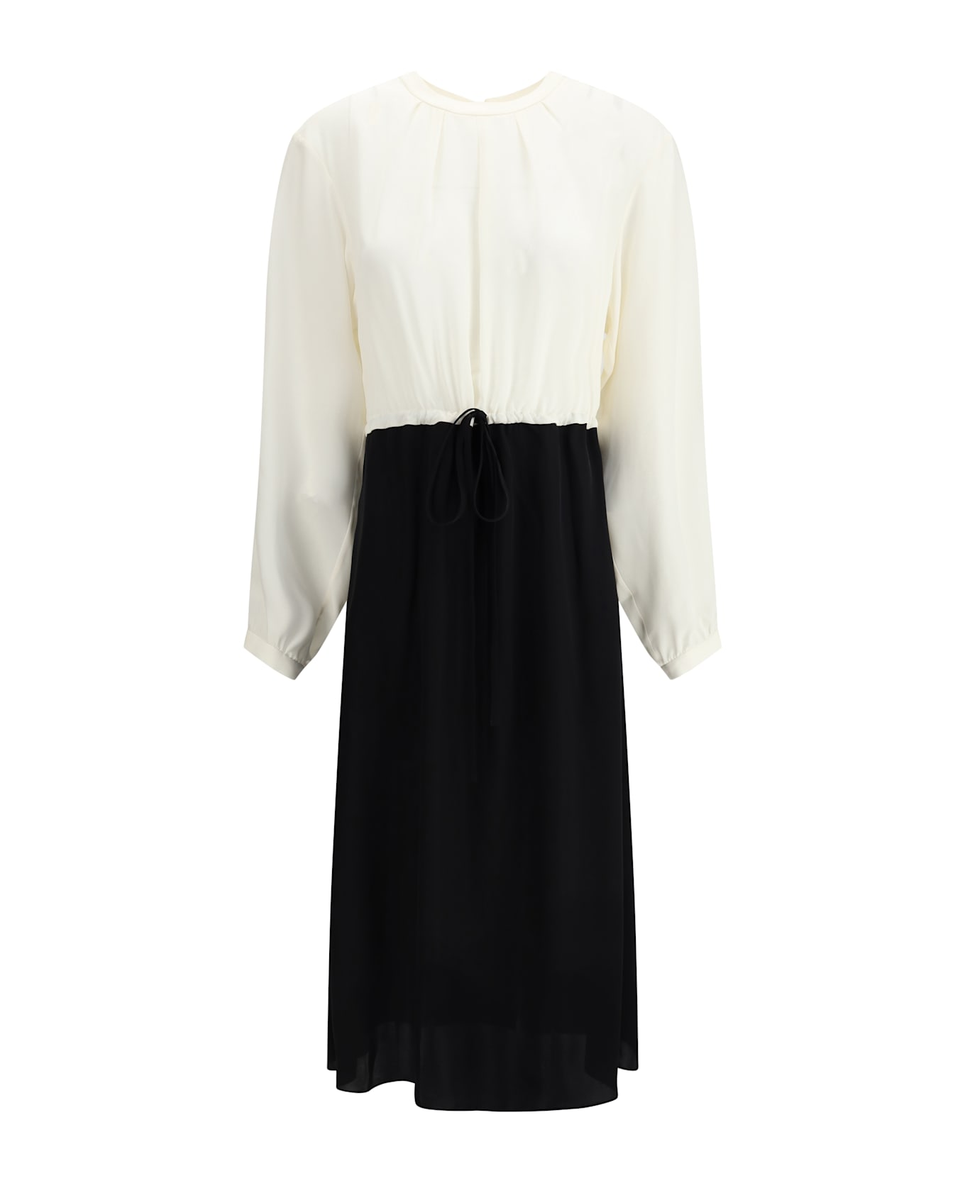 Correr midi dress by crida milano, made of fine silk for a light and refined effect. it features a simple crew neck, adjustable long sleeves with small buttons and a back button closure. the waistband is adjustable with a drawstring for a customized fit. completing the design are two side welt pockets and a contrasting skirt, which adds a touch of originality and movement to the garment. an elegant and versatile dress, perfect for special occasions and classy looks.