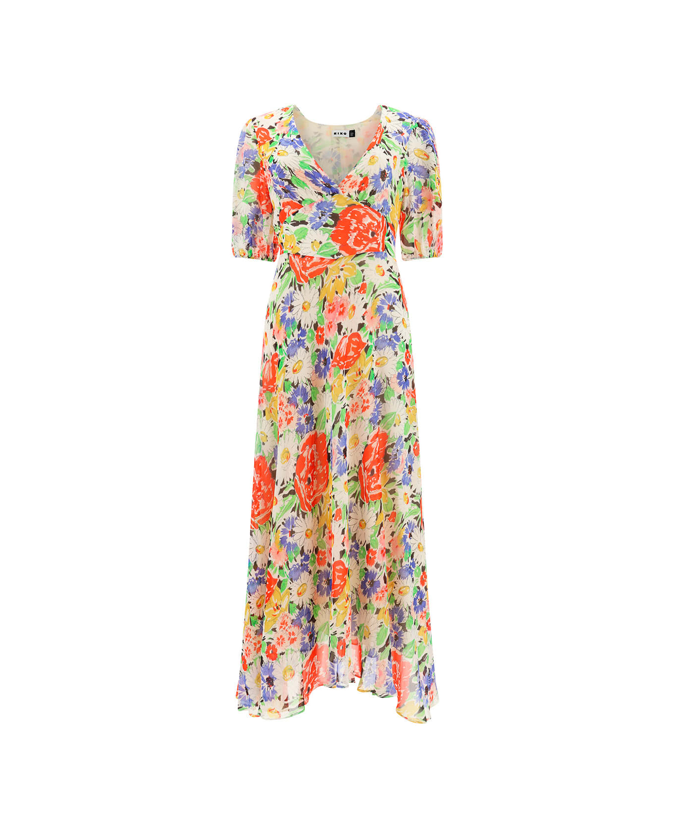 Corrine dress by rixo, v-neck front, short sleeves, invisible zipper closure on side panel, empire-style waist with ties, floral pattern, skirt with slight ruffle, loose silhouette. Composition: 100% % Viscose