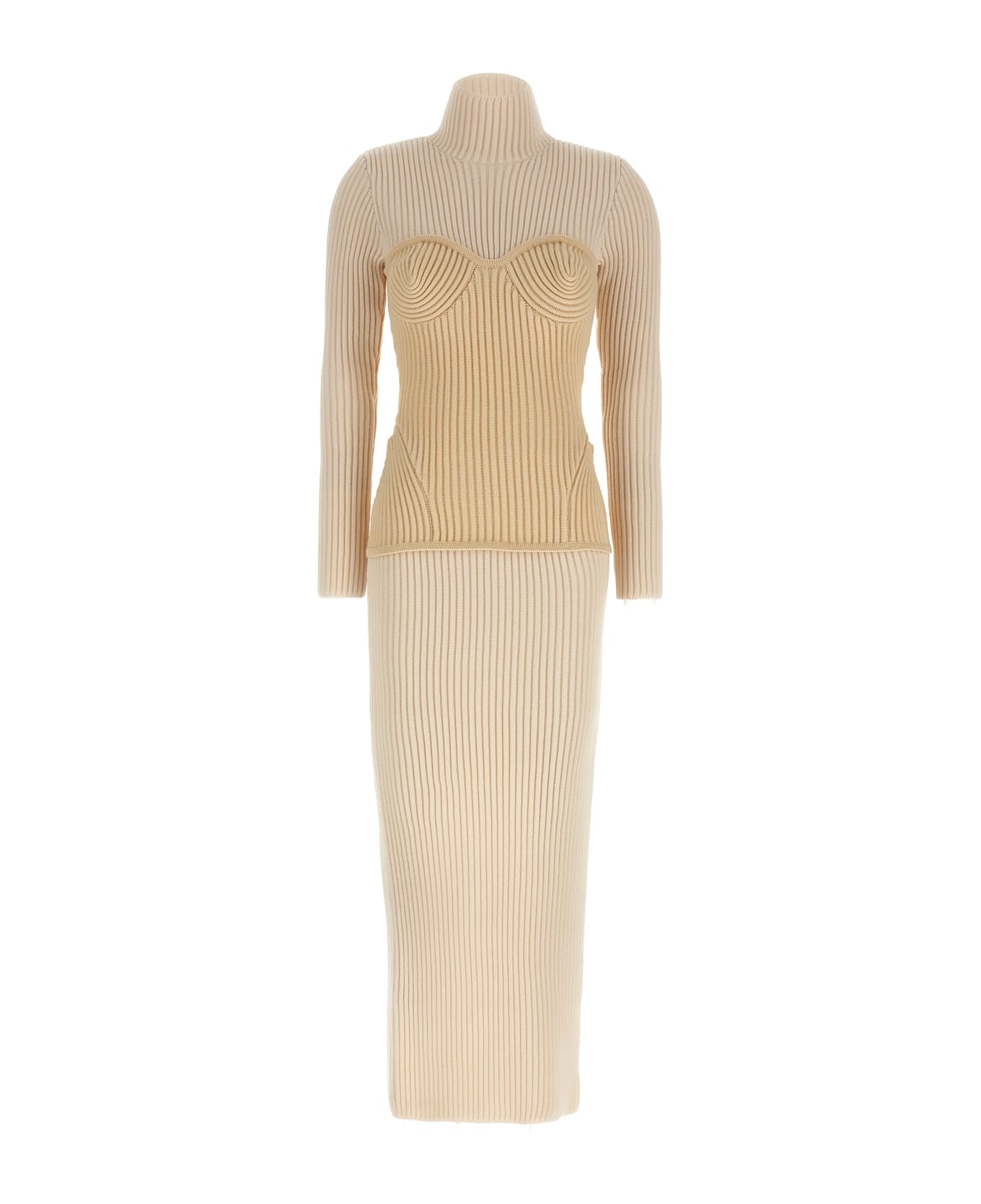 Long dress in ribbed merino wool, trompe l'oeil corset silhouette with pre-shaped cups, high neck, long sleeves, back split.