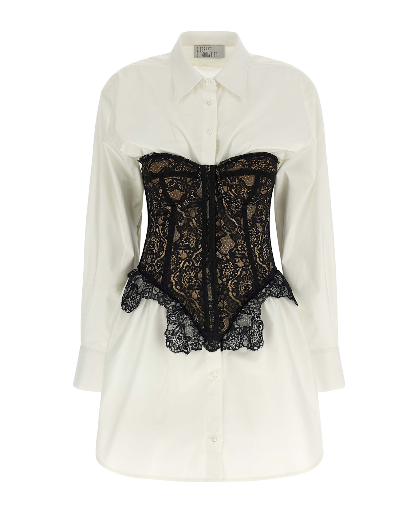 Cotton poplin dress, shirt style with integrated lace bustier, front button and hook closure, long cuffed sleeves.