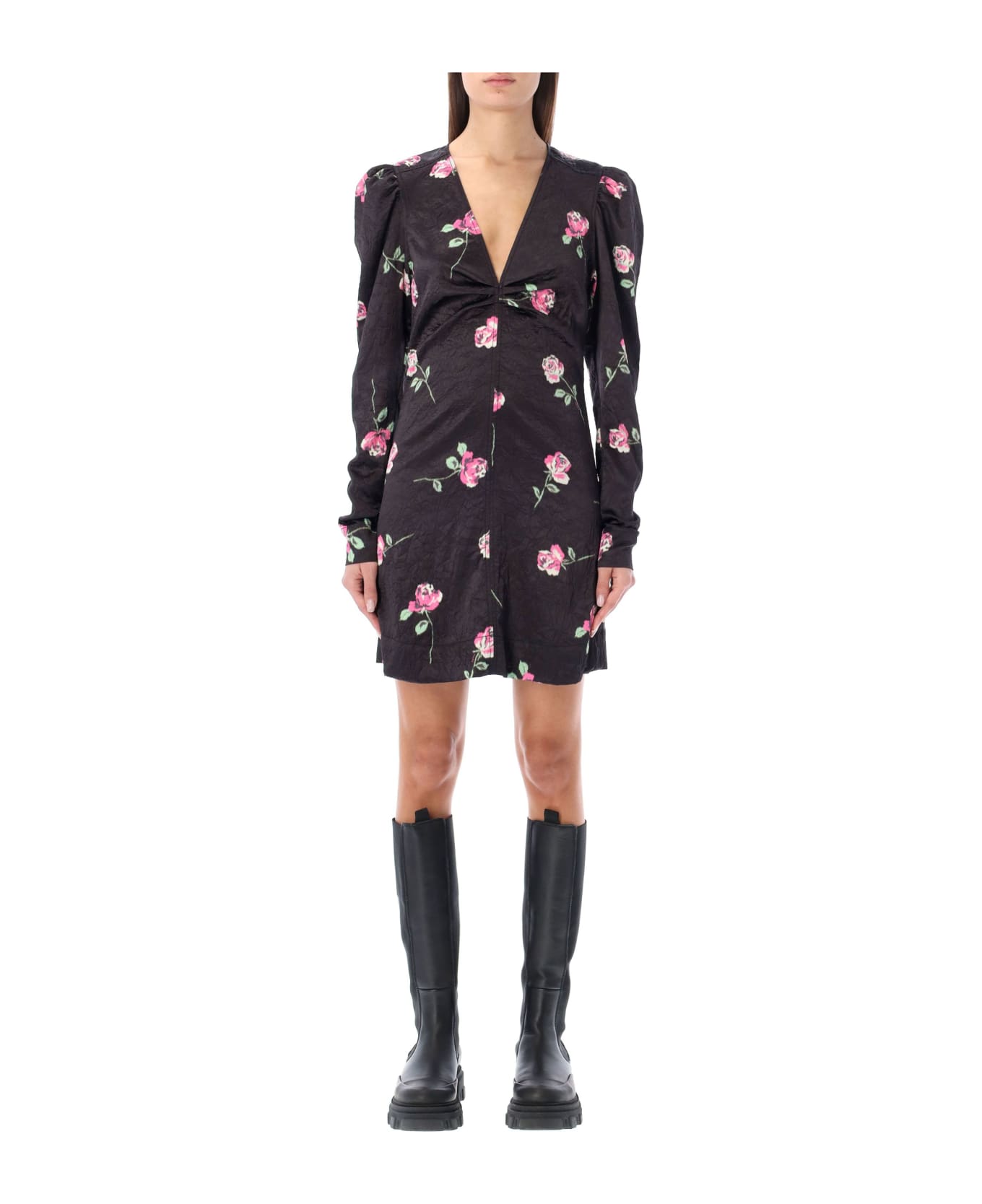 Crinkled Satin V-neck Mini Dress By Ganni. Featuring: Recycled Polyester Slim Fit V-neck Long Puff Sleeves Zip Closure At Side Floral Print Crinkled Satin Look Short Length Model Is 1,72 M Tall And She's Wearing Size 36