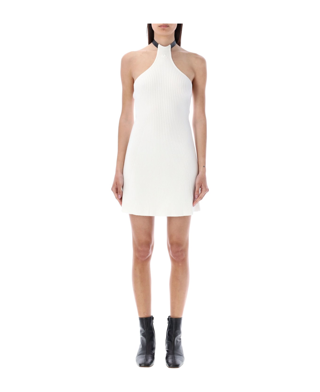 Crocher Rib Knit Mini Dress By Courreges. Featuring: Halterneck Leather Strap Snap Button Fastening Rib Knit Sleeveless Tone-on-tone Logo Patch At Front Fitted Above-knee Length Open Back Model Is 1,72 M Tall And She Is Wearing Size S