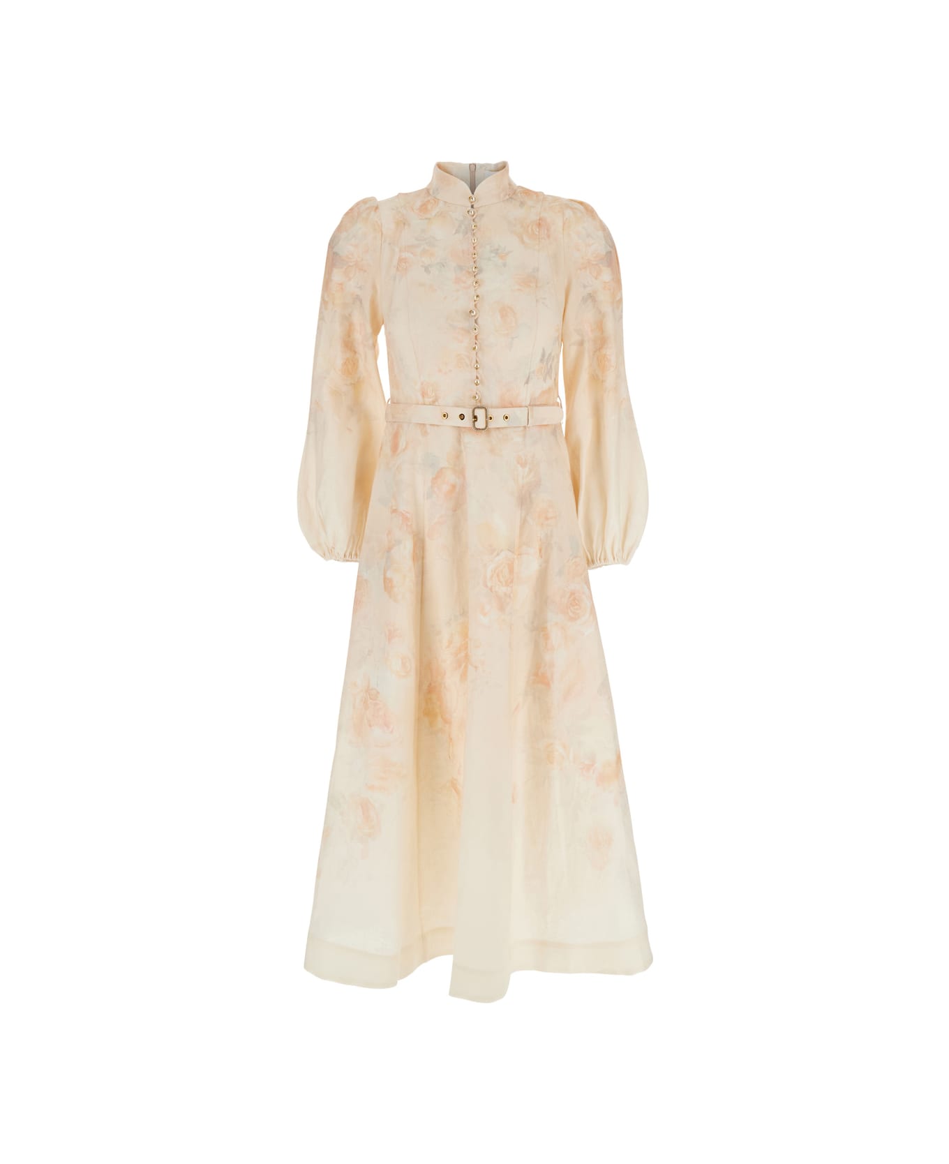 Midi dress Multicolor High neck Long puffed sleeves Front button closure Adjustable and removable belt Rear concealed zip closure Elastic cuffs Straight hem Linen Regular fit