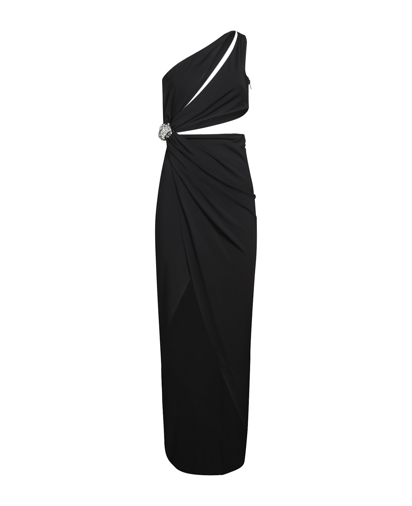 This elegant Amen black jersey dress features a sophisticated one-shoulder design, with a refined crystal decoration that accentuates the silhouette. Perfect for evening events, it combines comfort and luxury in a single piece. Composition: 100% Glass, 77% Acetate, 19% Polyamide, 4% Elastane