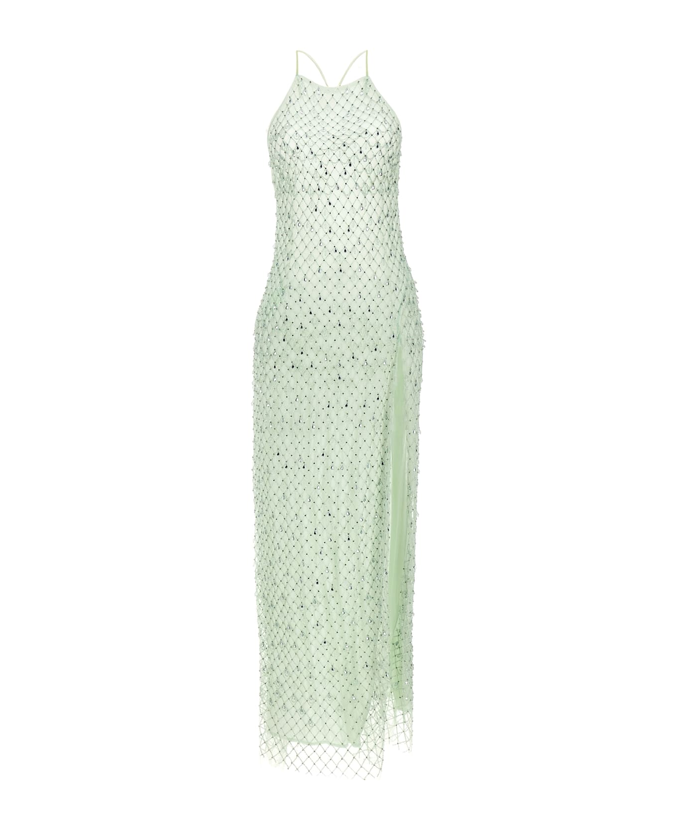 'Red Carpet' tulle dress with all-over crystals, American-style neckline and long skirt with side split, bare back with crossed suspenders thanks to the metal logo, knit lining.