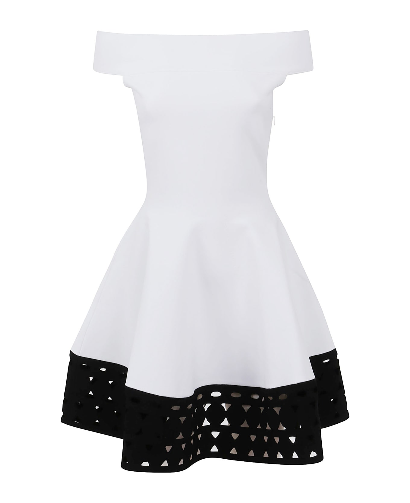 Knitted dress BY ALEXANDER MCQUEEN. Boat neckline; side closure with invisible zip. Fitted neck top and loose skirt design, above knee length. Contrast hem detail with cut-out embroidery.