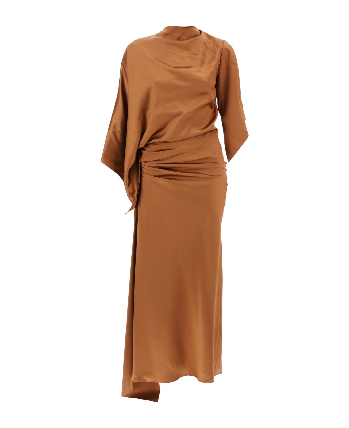 The Christopher Esber midi dress is made of pure silk satin, featuring a draped cape design with an asymmetrical hem and a deep back neckline. It has a hidden zip closure on the side and a relaxed fit with a fitted waist. The model is 177 cm tall and wears a UK size 6.