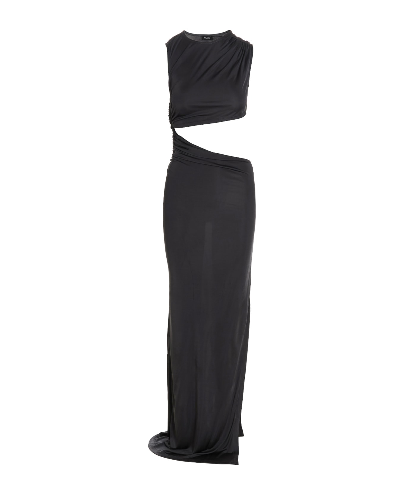 Shiny jearsey sleeveless dress with cut out detail on the side, crewneck and a wide side split.