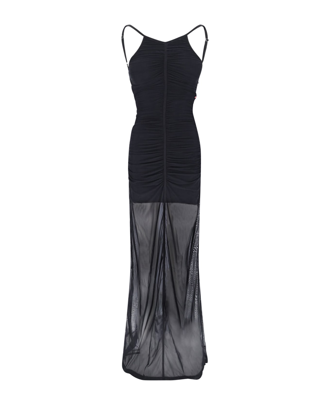 Diesel "D-Amami" maxi dress in black nylon with draped details at the front and back, round neckline, thin adjustable straps, semi-transparent nylon flared skirt, side logo label, deep neckline at the back, straight hem. Composition: 83% Polyamide, 17% Elastane
