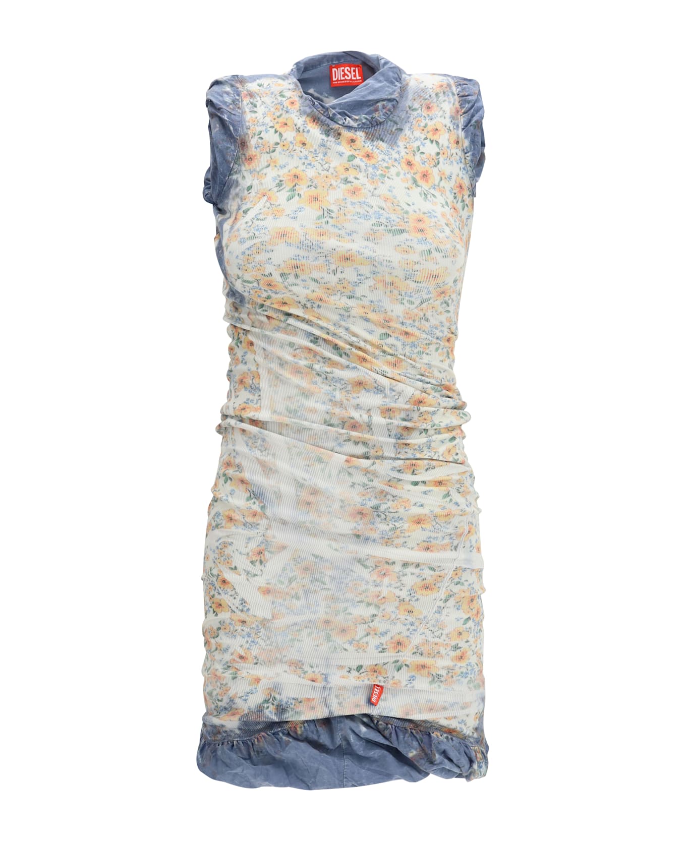 The d-ayana dress buy diesel expresses refined femininity through a contemporary lens. crafted from slightly sheer stretch knit, it features a body-hugging mini silhouette, wide straps, and a classic round neckline that enhances the shoulder line. set on a white base, the design is defined by a multicolored floral print, enriched by ombré shading highlighting the shoulders and hem. ruching and draped detailing sculpt the figure, creating dynamic movement and elevated elegance. a distinctive statement piece signed by diesel.