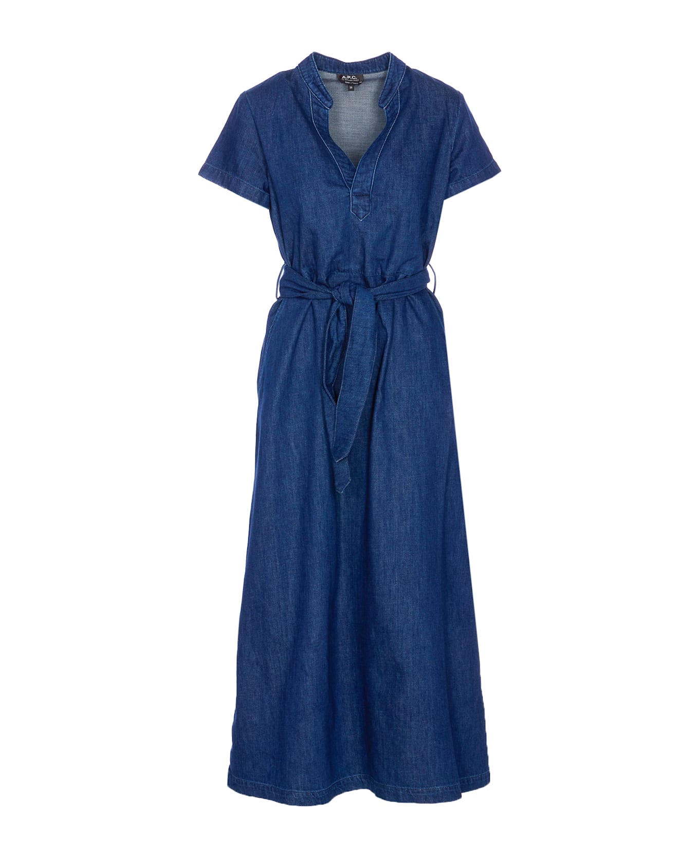 A. P. C. denim Annelie dress,V-neck, short sleeves, belt on waist, pockets on side