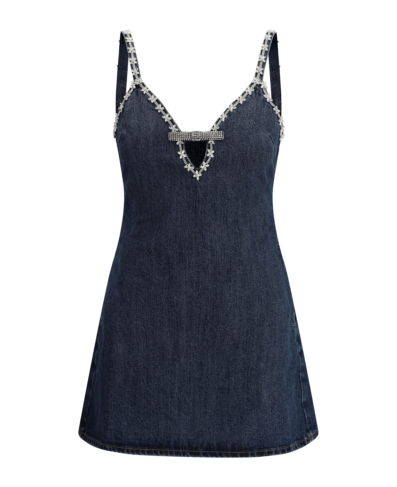 Self-portrait's denim mini dress is an elegant and refined piece perfect for a special occasion. the slender shoulders are embellished with shiny appliqué jewels, adding a touch of sparkle and glamour. the zipper and hook-and-eye closure at the back ensures a flawless fit. the design includes a v-neckline that enhances the décolletage, while the cut-out detail on the front, complemented by an applied jewel bow, creates a chic and sophisticated effect. the whole is embellished with additional details with shiny jewels that add brightness and a touch of sophistication. a dress that combines elegance and modernity, perfect for those seeking a unique and sparkling look.