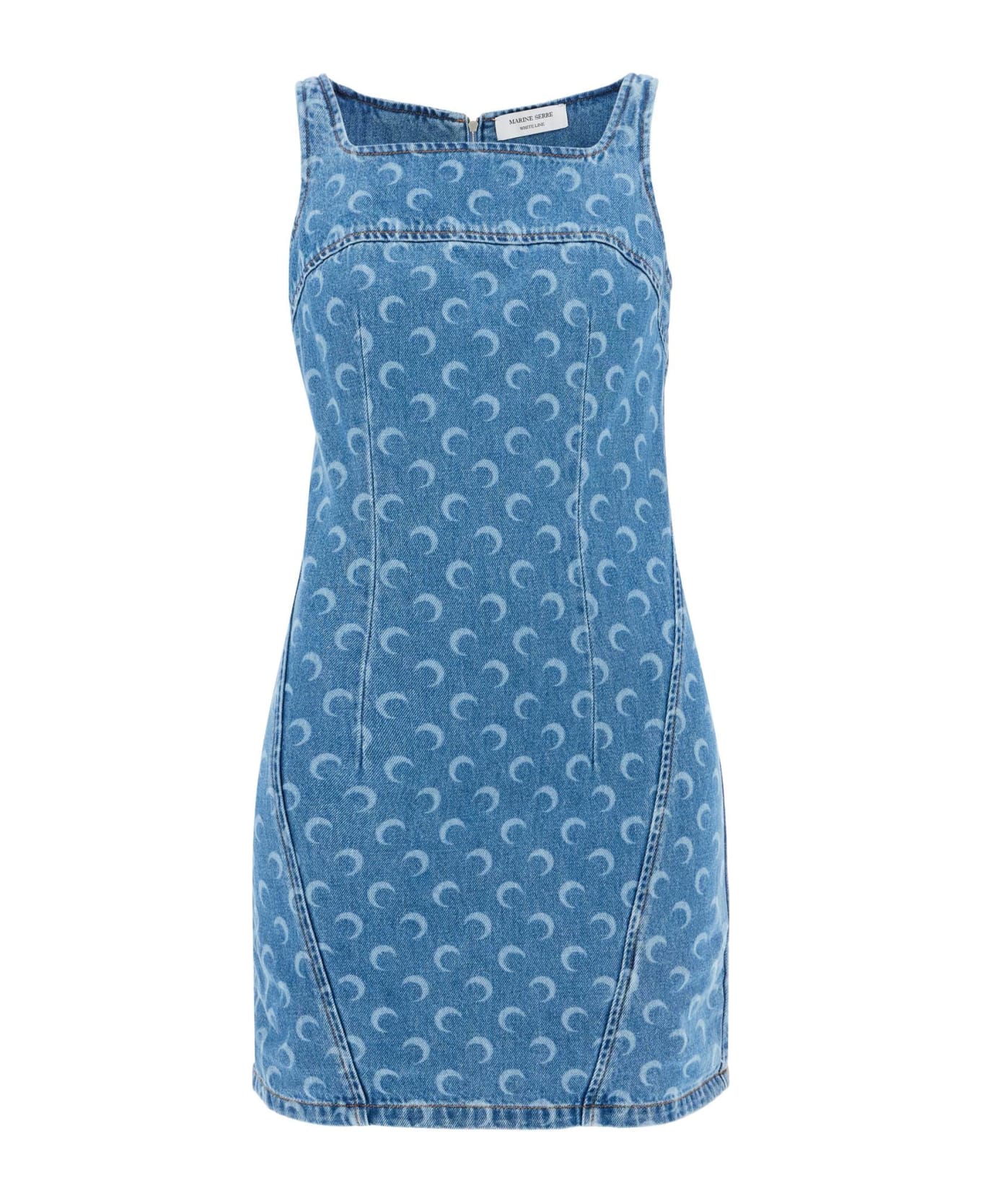 This Marine Serre mini dress is made of pure cotton denim with a light wash, enriched by the iconic Moon motif laser-printed all over. It features a square neckline and a visible zip closure on the back. The fitted cut is accentuated by twisted side seams and signed with a branded jacron on the back. The model is 177 cm tall and wears a size FR 36.
