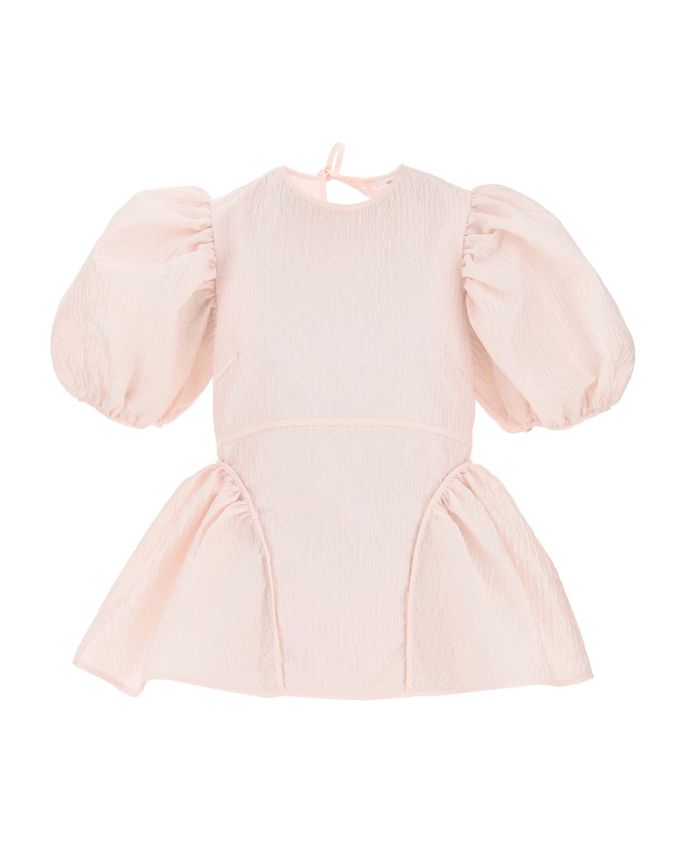 Cecilie Bahnsen crew neck top made of crinkled fabric with short balloon sleeves and large rococo-inspired side panels. Back closure with ties, lined interior. The model is 177 cm tall and wears a size UK 8.