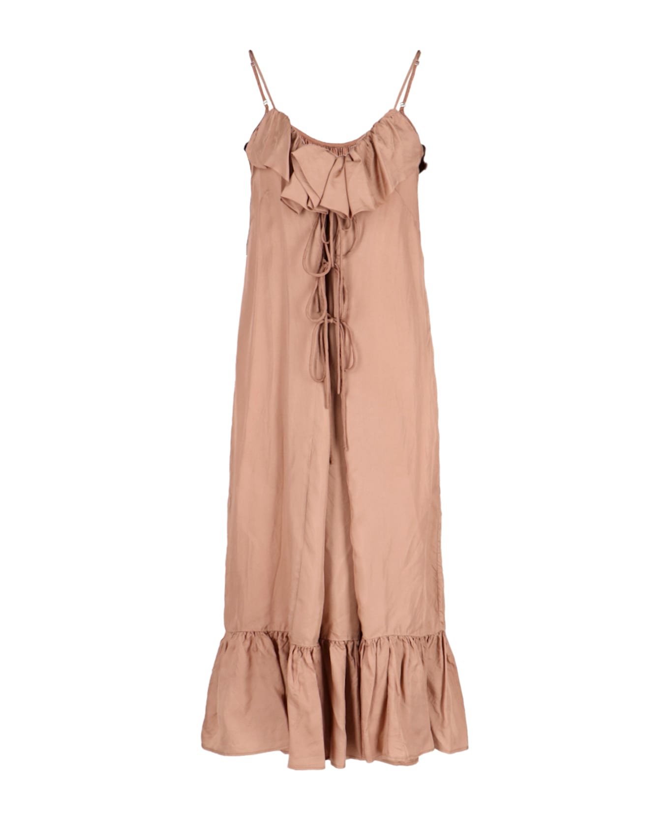 Dries Van Noten 'Dimba' ruffled midi dress in pink viscose with V-neck, ruffled detail, thin straps, sleeveless, adjustable laces at the front, deep neckline at the back, draped details on the hem, flared hem.