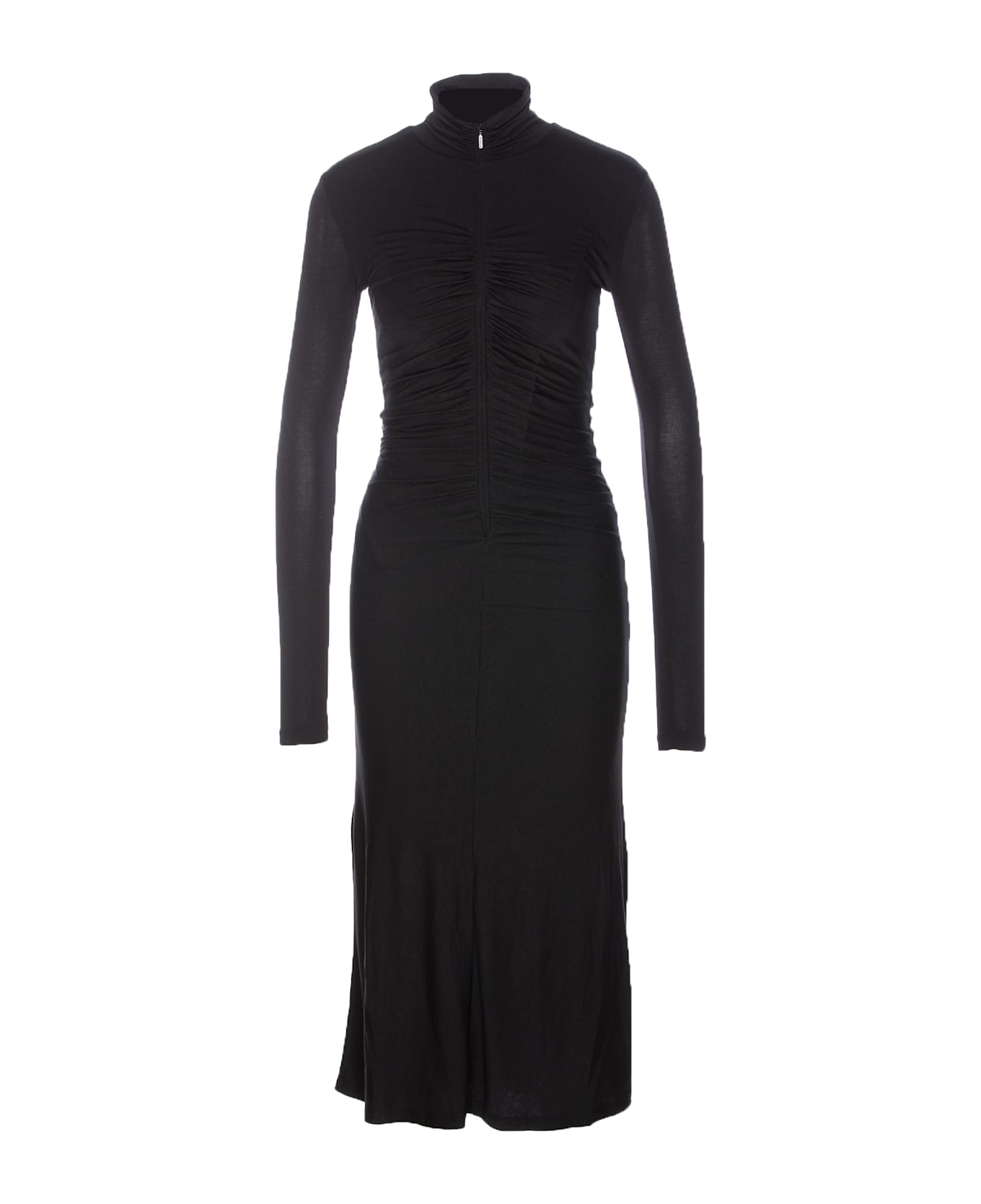 Pinko black Dimitrova dress, zip closure on the front, high neck, long sleeves, ruffled on the front and on the back, tight fit, long model