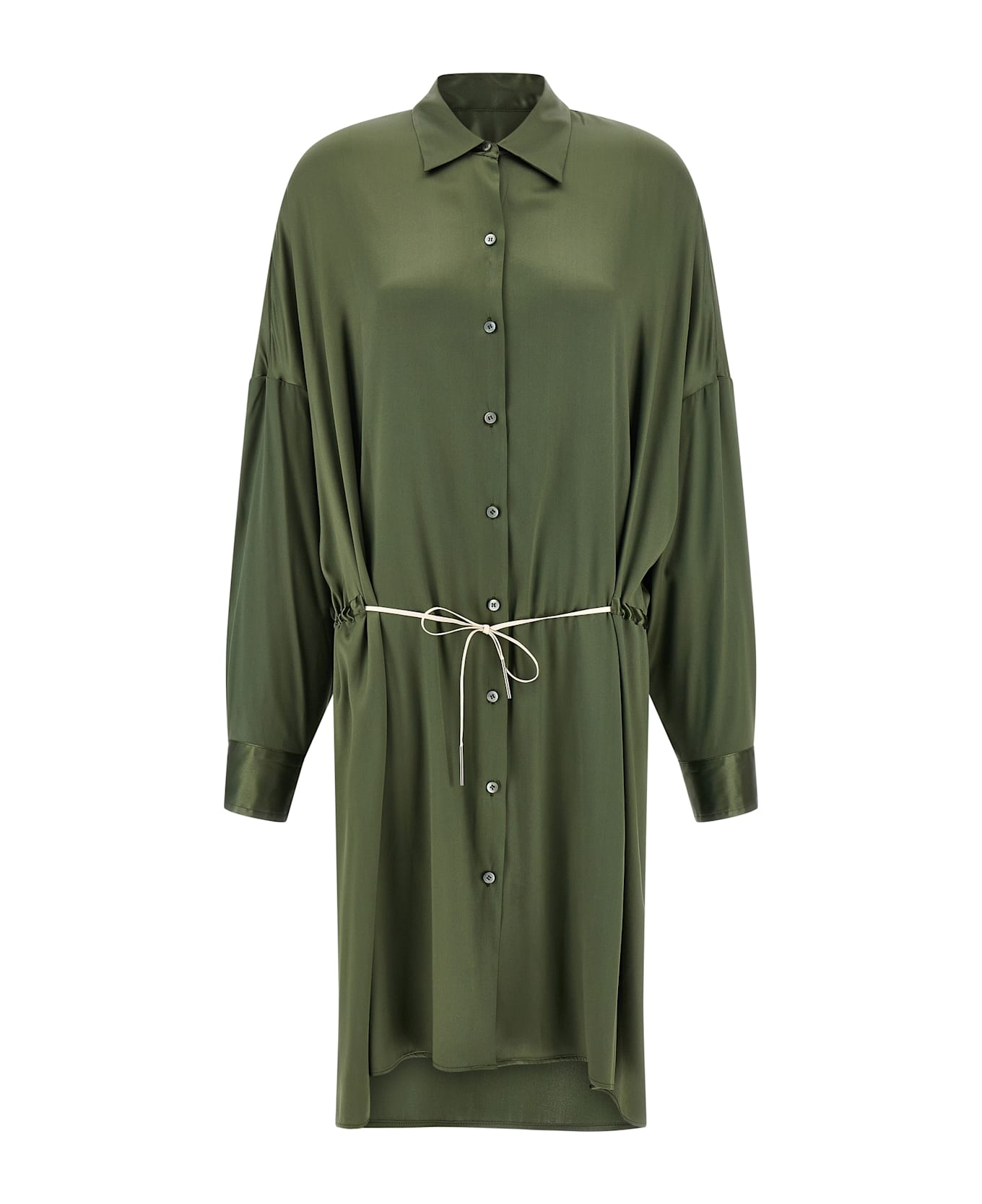 'Dinidia' silk satin dress, shirt style with shirt collar and front button closure, adjustable drawstring at the waist, long sleeves with cuffs.